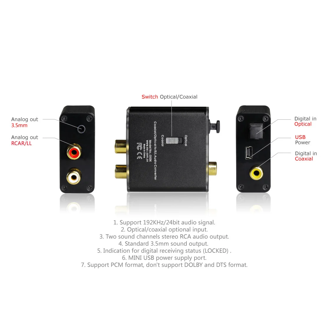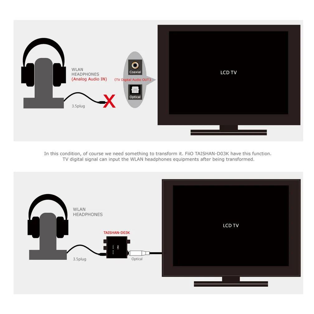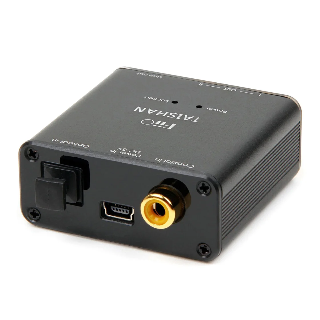The FiiO D03K TAISHAN is a mini DAC in a compact housing. The device features optical and coaxial inputs for receiving digital audio signals, and an analog stereo output represented by RCA connectors and a mini-jack socket. It can be used to connect players or TVs with digital outputs to analog integrated amplifiers or mini-systems to improve the sound quality of the system. Additionally, the presence of a 3.5mm output allows for connection to devices such as wireless headphone transmitters that do not have other types of connectors. This device can also come in handy in many other scenarios.