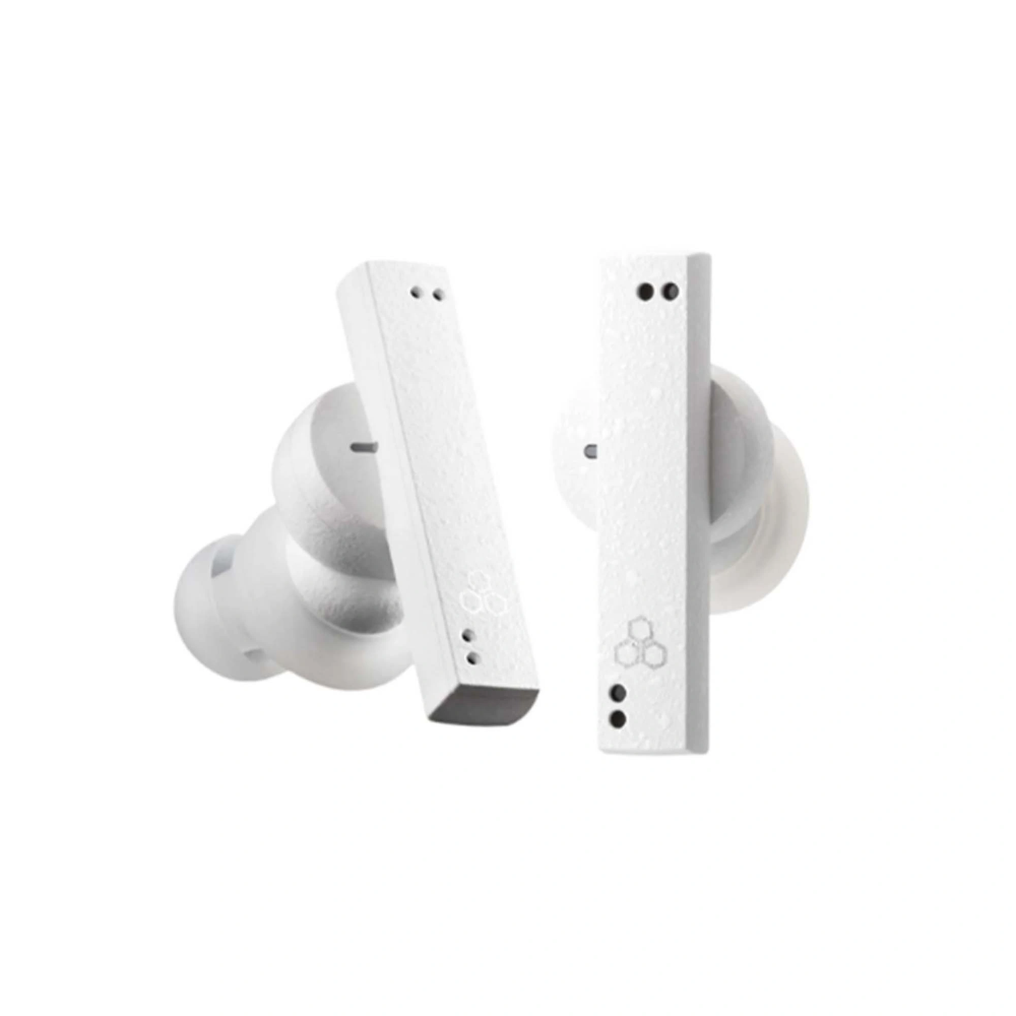 The earphones are available in two color options: BLACK and WHITE. Both the earphones and the charging case feature a lightweight resin construction, yet they are finished with a luxurious, glossy texture reminiscent of high-end camera bodies. Typically, this type of textured finish is applied to metal surfaces through baking, but we have developed a special process that allows this finish to be applied to resin surfaces as well.