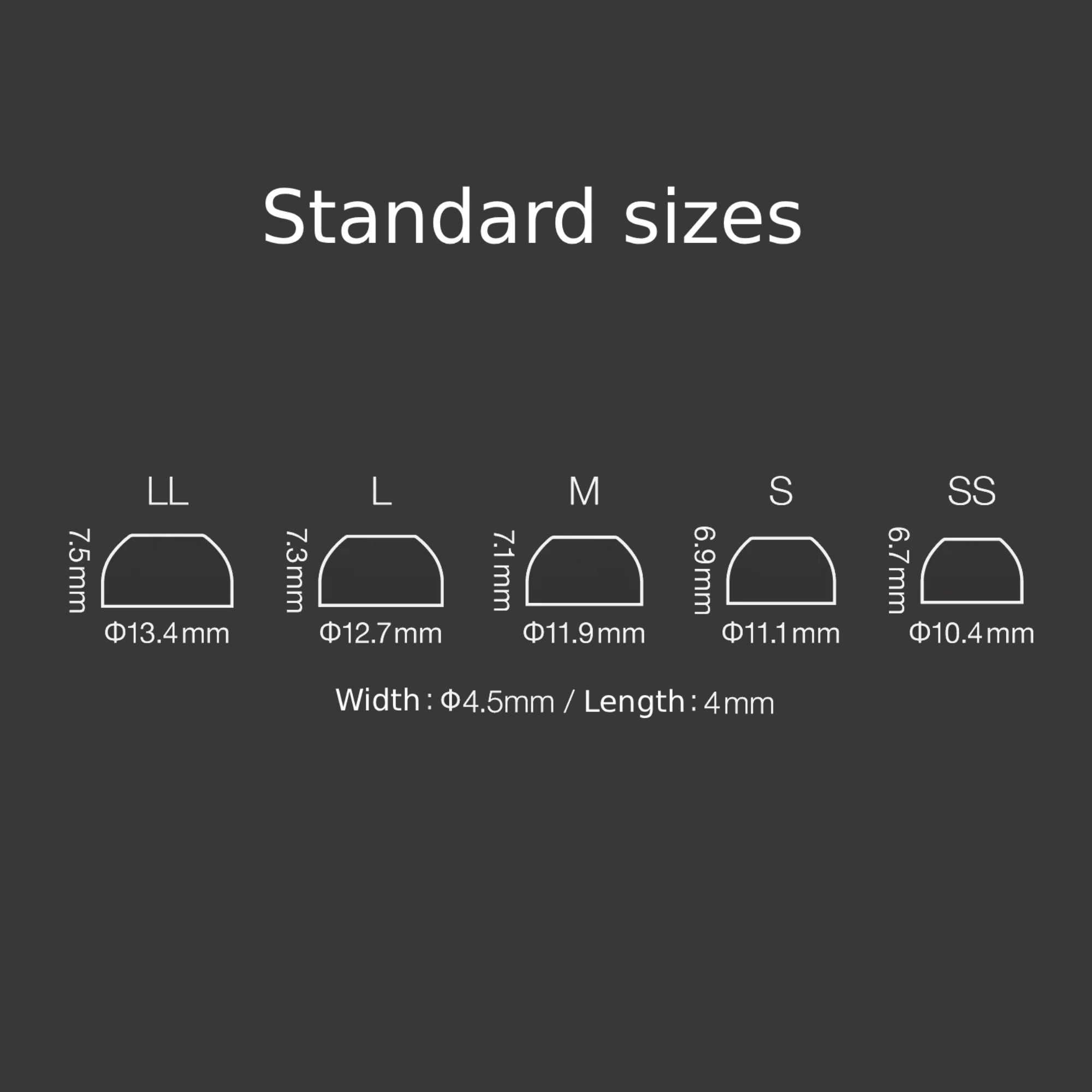 Each size is color-coded along the stem, alternating between dark gray and light gray for neighboring sizes. This allows for quick and easy selection, even when managing multiple sets of earpieces.