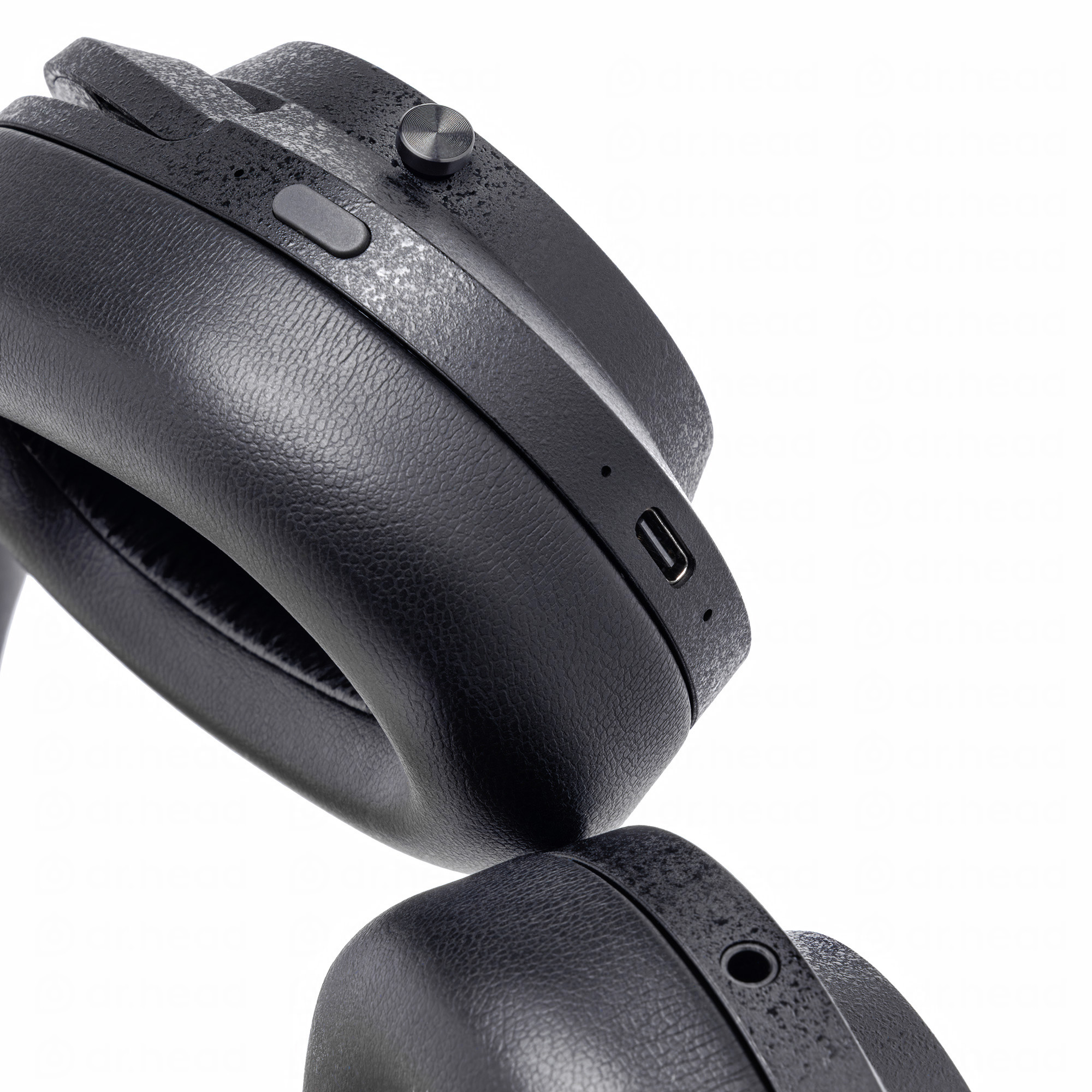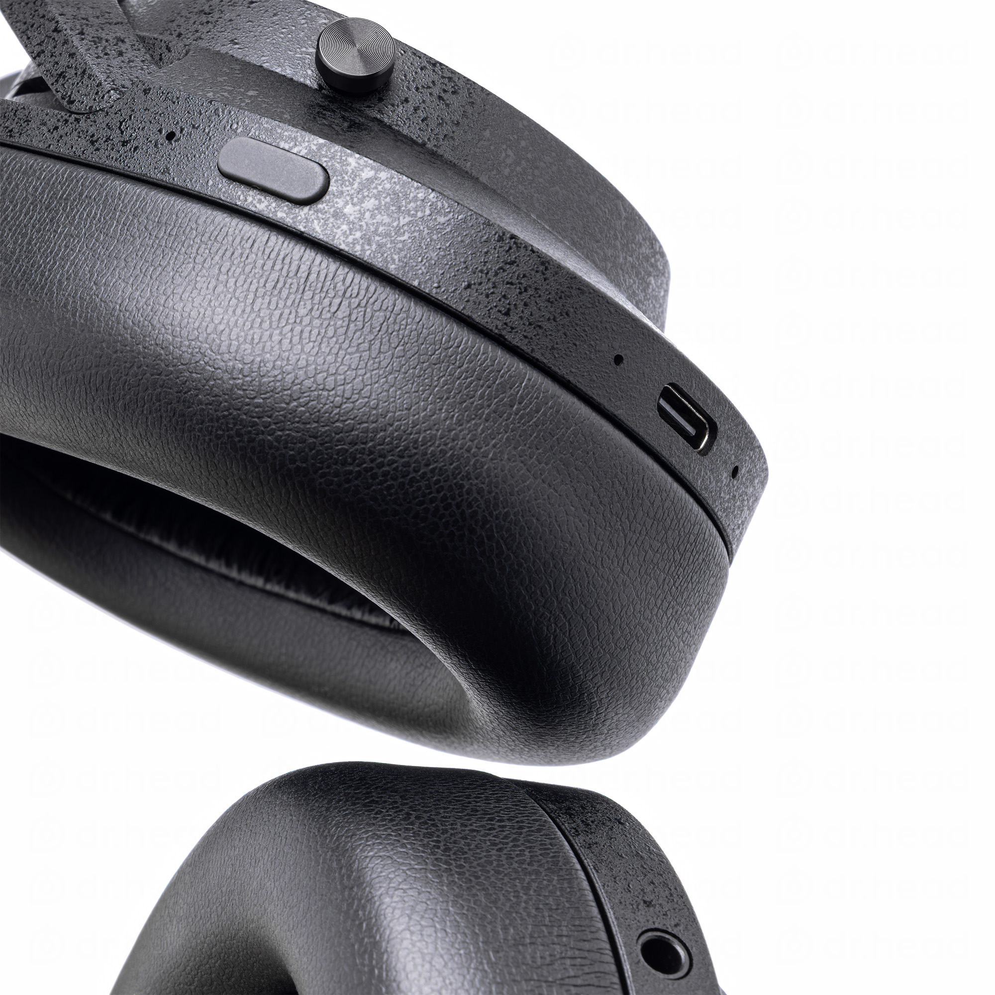 The ear pads are made of low-elasticity material, providing both sound isolation and comfort, while the headband is made of high-elasticity material to distribute pressure on the head evenly. Optimal materials are used for each area to ensure a comfortable fit. The ear pads attach with magnets, and the headband has a detachable connector (USB Type-C) for easy replacement without tools.