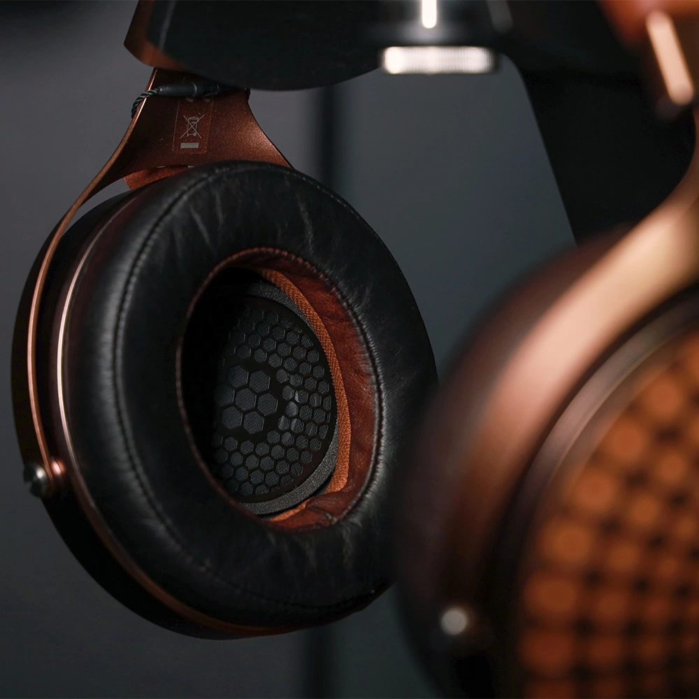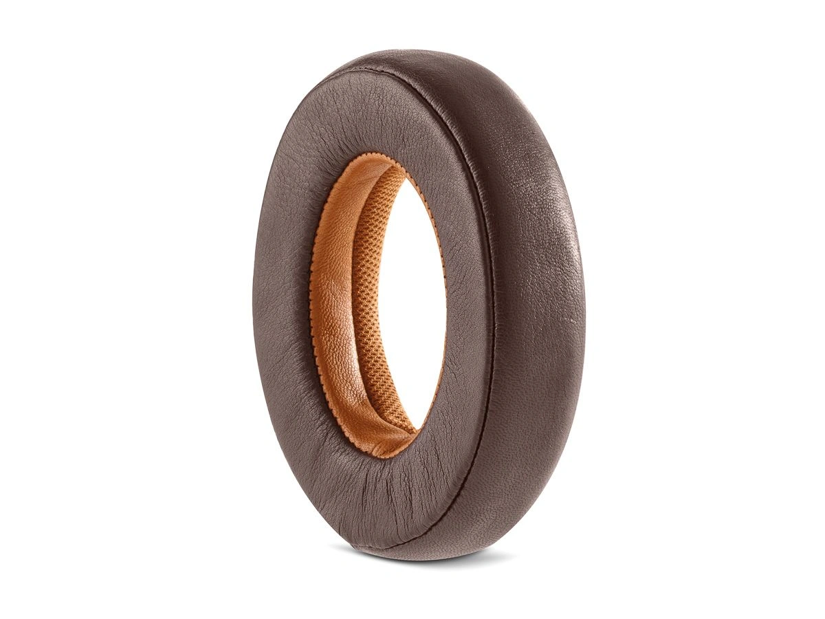 - Unpolished full-grain leather in "cognac" and "mocha" shades for the headband, earcups, and earpads