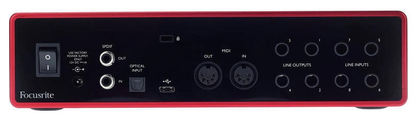 The Scarlett 18I8 features four microphone/line inputs, two of which can be used as instrument inputs, four line inputs, four balanced line outputs, plus two independent headphone outputs for monitoring, mixing, and playback. Whatever you're recording, wherever you are, the Scarlett 18I8 will be your faithful "studio" companion.