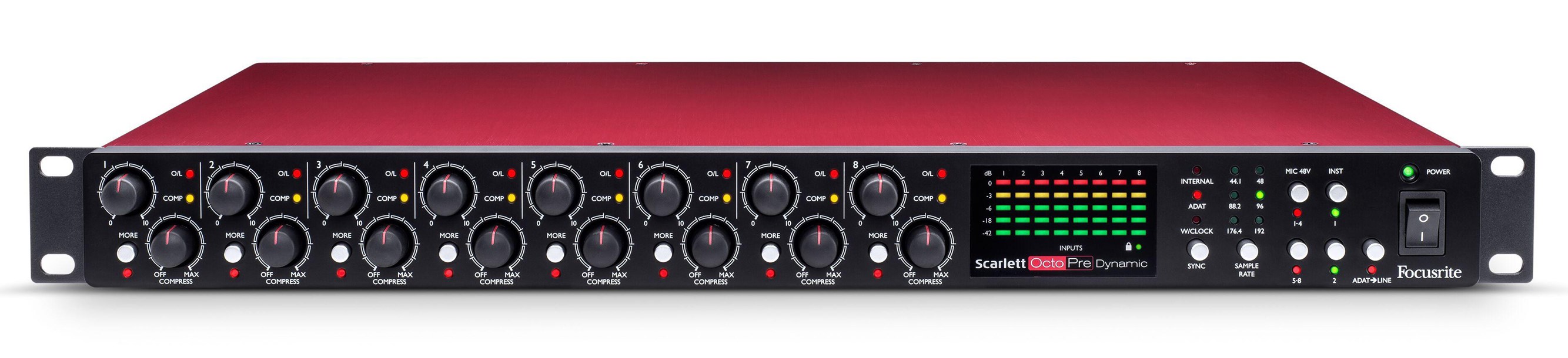 The Focusrite Scarlett OctoPre Dynamic microphone preamp is based on the design of the earlier OctoPre MkII Dynamic model. This eight-channel interface is built on the second-generation Scarlett preamps, known for their natural sound. The preamp offers 8 combined microphone/line inputs, each equipped with a VCA preamp and compressor. Two of the inputs can be switched to instrument mode and feature DI digital interfaces for connecting guitars/basses. Additionally, each input provides phantom power of 48V for condenser microphones. Analog-to-digital converters provide conversion of up to 24-bit/192kHz. The Scarlett OctoPre Dynamic allows for controlling the dynamics of all input signals in either "Soft-Knee" classic compression mode or "More" mode with double the compression ratio. The compression level and ratio can be adjusted using the controls, and a wide range of LED indicators on the front panel provide monitoring. The audio interface offers extensive connectivity options, including 8 line outputs for directly outputting signals from the microphone inputs or additional expansions, as well as two optical digital inputs and outputs, and BNC i/o for World Clock synchronization. This allows to meet the needs of even the most demanding performer. The internal generator provides +/- 20 PPM jitter performance, and the standard JetPLL jitter elimination technology is used for external generators.
