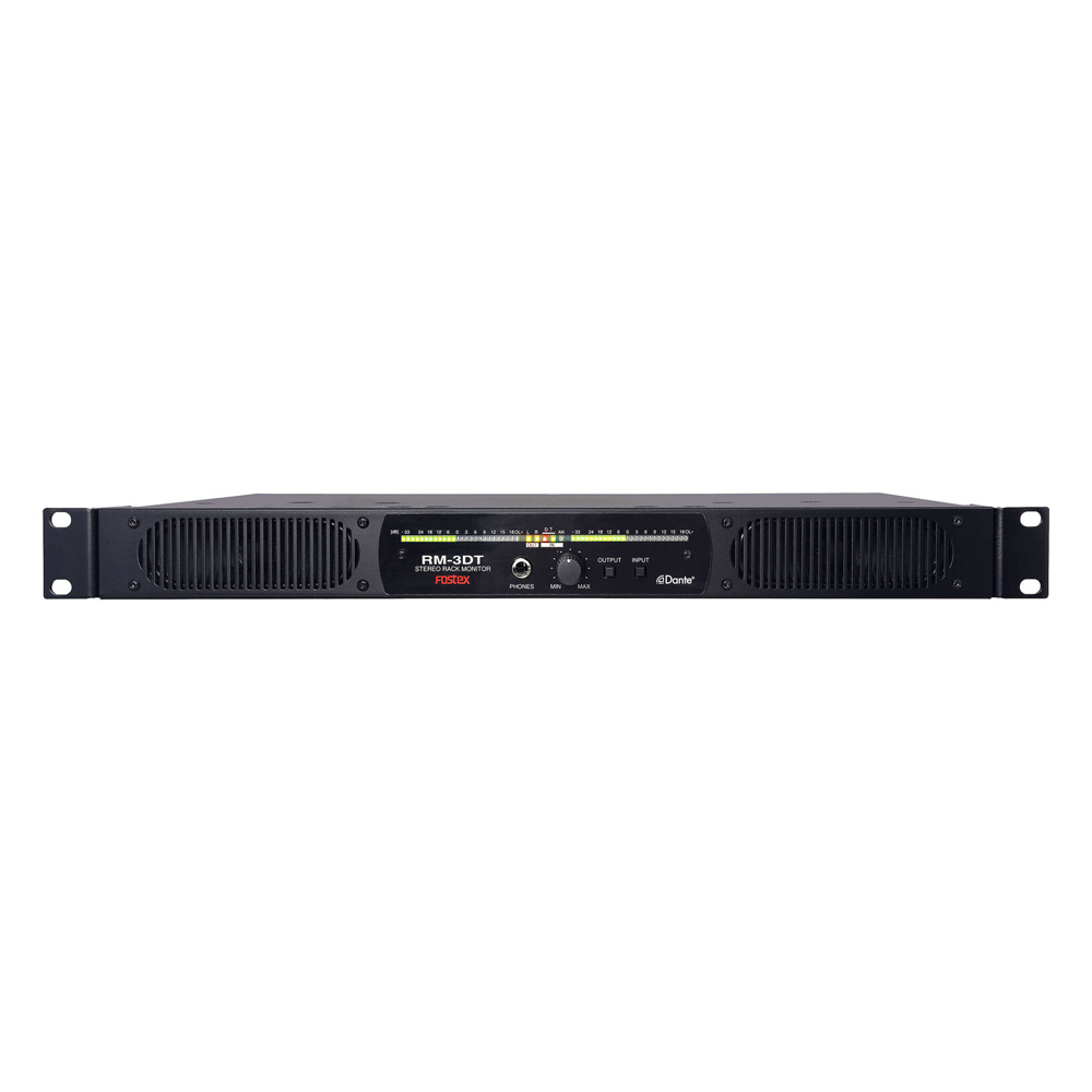 Designed to fit the monitoring needs of space-challenged environments like machine rooms, surveillance operations, and mobile or stationary control rooms, the Fostex RM-3DT is a Dante-equipped active monitor speaker that occupies just 1 RU of rack space. It can accept digital signal over a Dante network or a stereo analog source via balanced XLR inputs, ensuring compatibility with a wide range of systems. Signal can be output in one of four modes to the built-in rectangular stereo speakers, while the balanced XLR output jacks act as a thru-put to send the analog input to another destination. The front-panel 1/4" headphone jack allows for personal monitoring without pushing sound through the speakers.