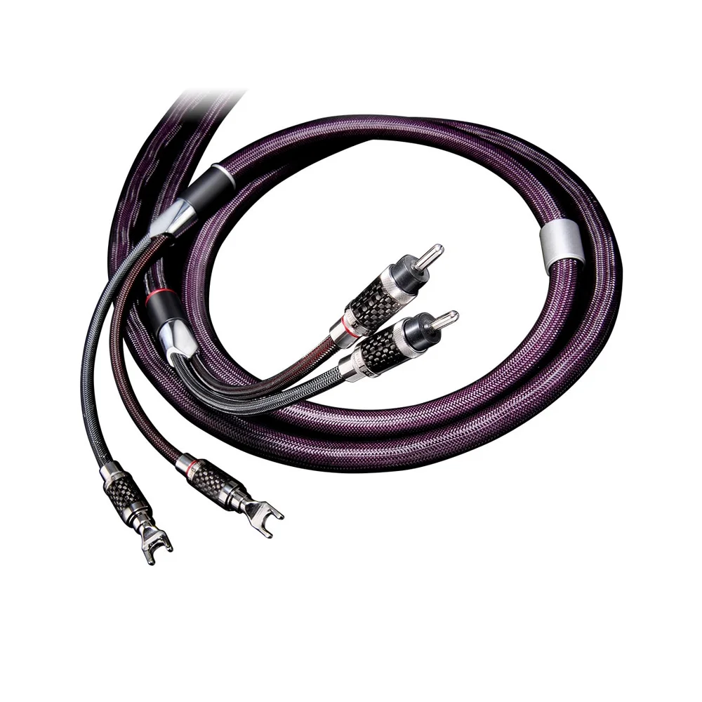 Furutech Speakerflux - a set of speaker cables used to connect high-class sound systems. The conductor is made of non-magnetic copper. The dielectric is made of polyethylene, and high-purity copper is used as a shield. The cables are equipped with CF-202(R) Carbon Banana plugs and CF-201(R) Carbon Spades, allowing for connection of speakers of different types.