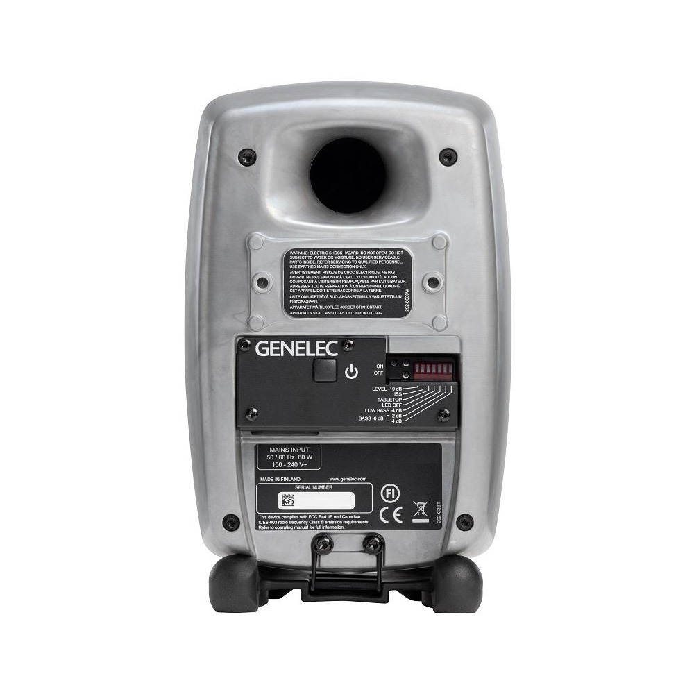 The cabinet of the Genelec 8020D features a 4" woofer cone and a 0.75" metal dome tweeter, delivering a flat frequency response and wide sound dispersion. The speakers utilize neodymium magnets to minimize interference with surrounding equipment and protect against overheating. The rear panel houses a round bass reflex port, enhancing the lower frequency range. The cabinet is also magnetically shielded to prevent signal interference.