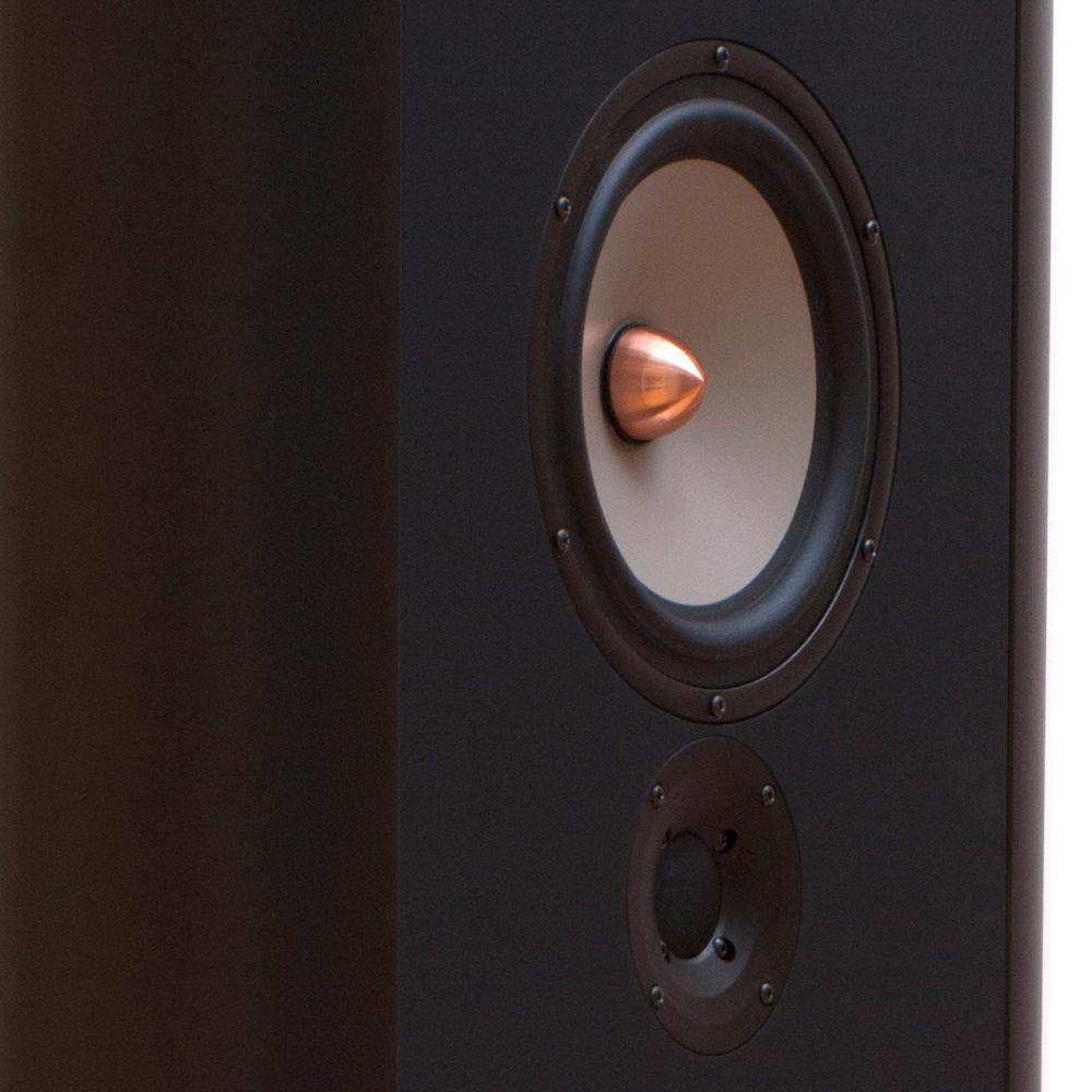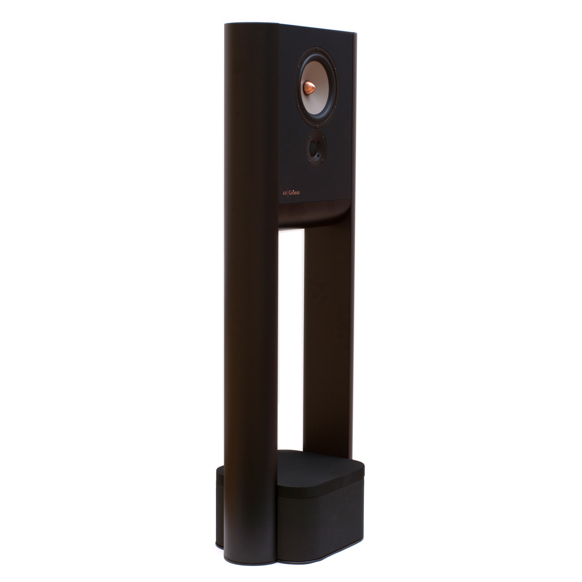 Looking at the design, the box is much wider than it is deep, the small (14 litres) sealed box is designed to provide an effective baffle down to around 250Hz. It is suspended between two half cylinders that combat diffractions and function as an integral two-legged floor stand. An 8” magnesium woofer and a 1” dome tweeter divide the work between them. Smart use of DSP via a Computer Aided Calibration process during production linearizes the frequency response and allows for a controlled bass response down to 35 Hz.