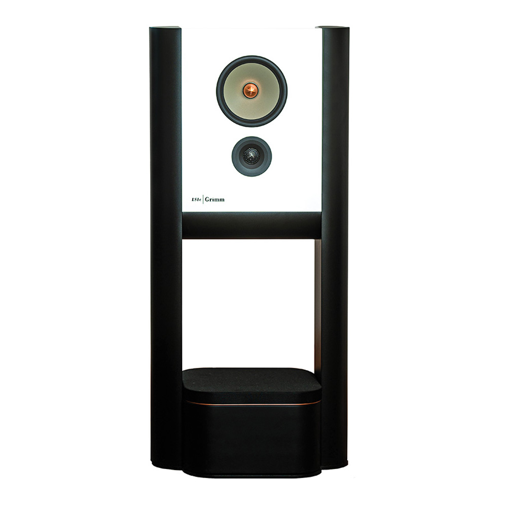 Looking at the design, the box is much wider than it is deep, the small (14 litres) sealed box is designed to provide an effective baffle down to around 250Hz. It is suspended between two half cylinders that combat diffractions and function as an integral two-legged floor stand. An 8” magnesium woofer and a 1” dome tweeter divide the work between them. Smart use of DSP via a Computer Aided Calibration process during production linearizes the frequency response and allows for a controlled bass response down to 35 Hz.