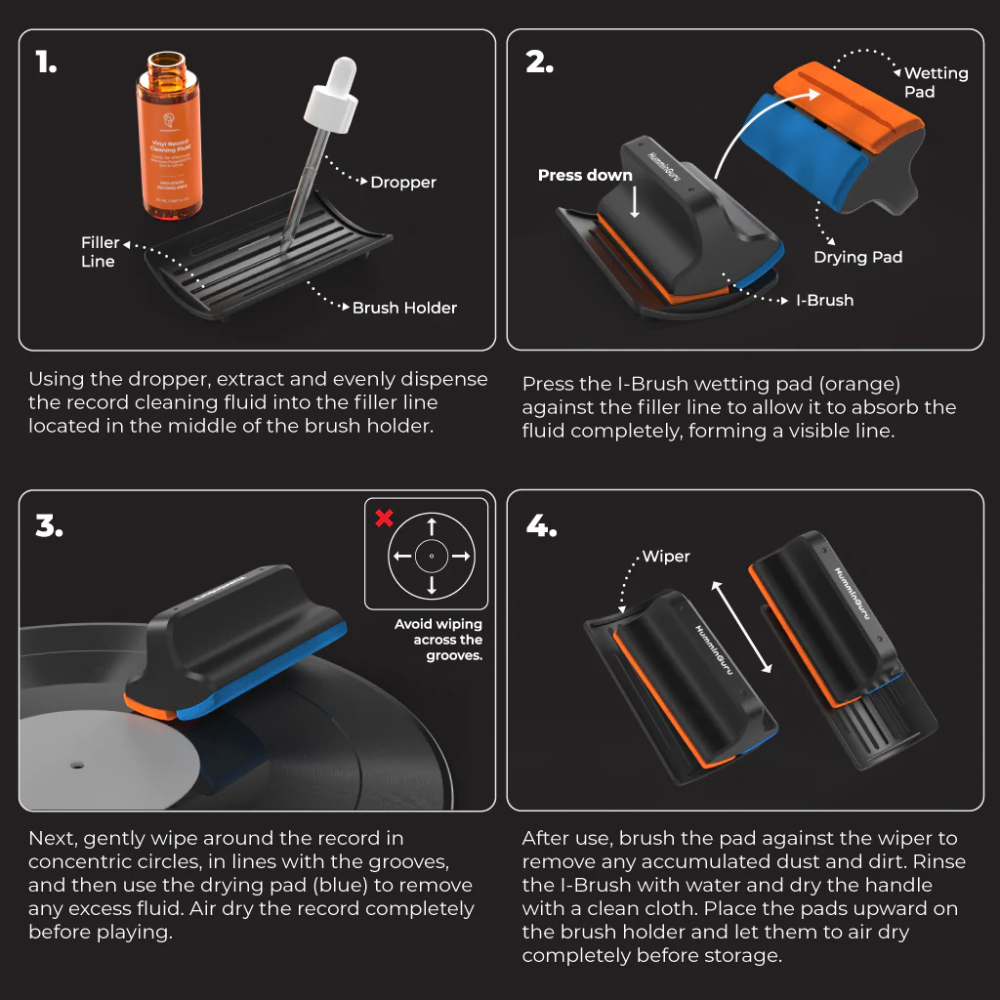 The HumminGuru I-Brush, with the use of the non-alcoholic record cleaning fluid, is a must-have kit for all record lovers, whether for a quick, gentle pre-clean to remove microdust, static, dirt & grime before record playing or for preparing records for a deep clean in an ultrasonic bath. Featuring ultra-velvet dual pads for separate wetting and drying, the I-Brush ensures minimal risk of cross-contamination. It also eliminates the hassle of spraying by incorporating a filler line on the brush holder that maintains the precise amount of cleaning fluid needed. This thoughtful design allows for optimal absorption and even distribution of the fluid on the brush pad, resulting in a more efficient and safe record cleaning. The brush holder serves for air drying and storage while the built-in wiper makes it convenient for dust removal and pad cleaning. Let the I-Brush lead the way to hassle-free record maintenance! Learn More