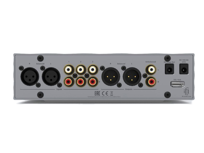 - Inputs: Balanced (XLR pair), unbalanced (3 pairs of RCA)