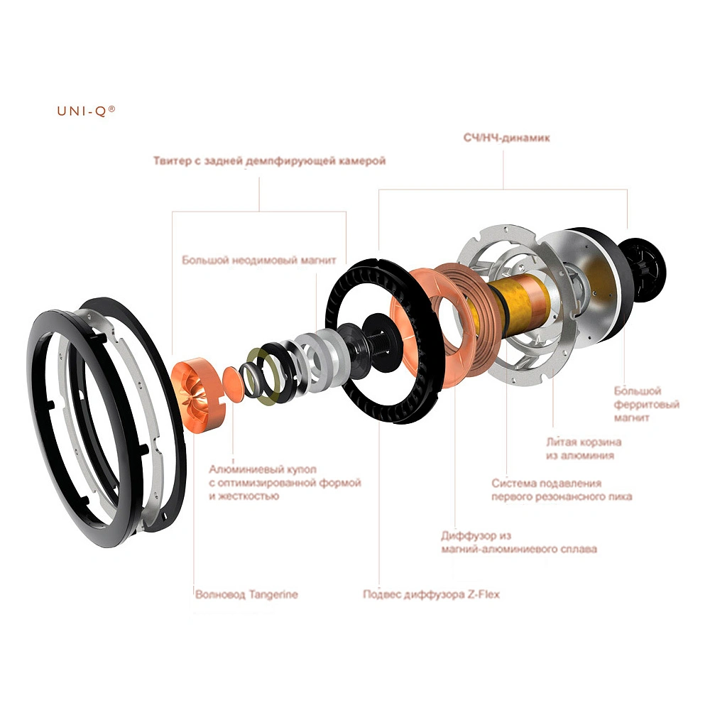 The grilles have magnetic attachments and are made using UTB (Ultra-Thin Bezel) technology. The metal grille has a narrow, practically invisible frame. It is painted white, but it can be repainted to match the interior color scheme so that the speakers blend in.