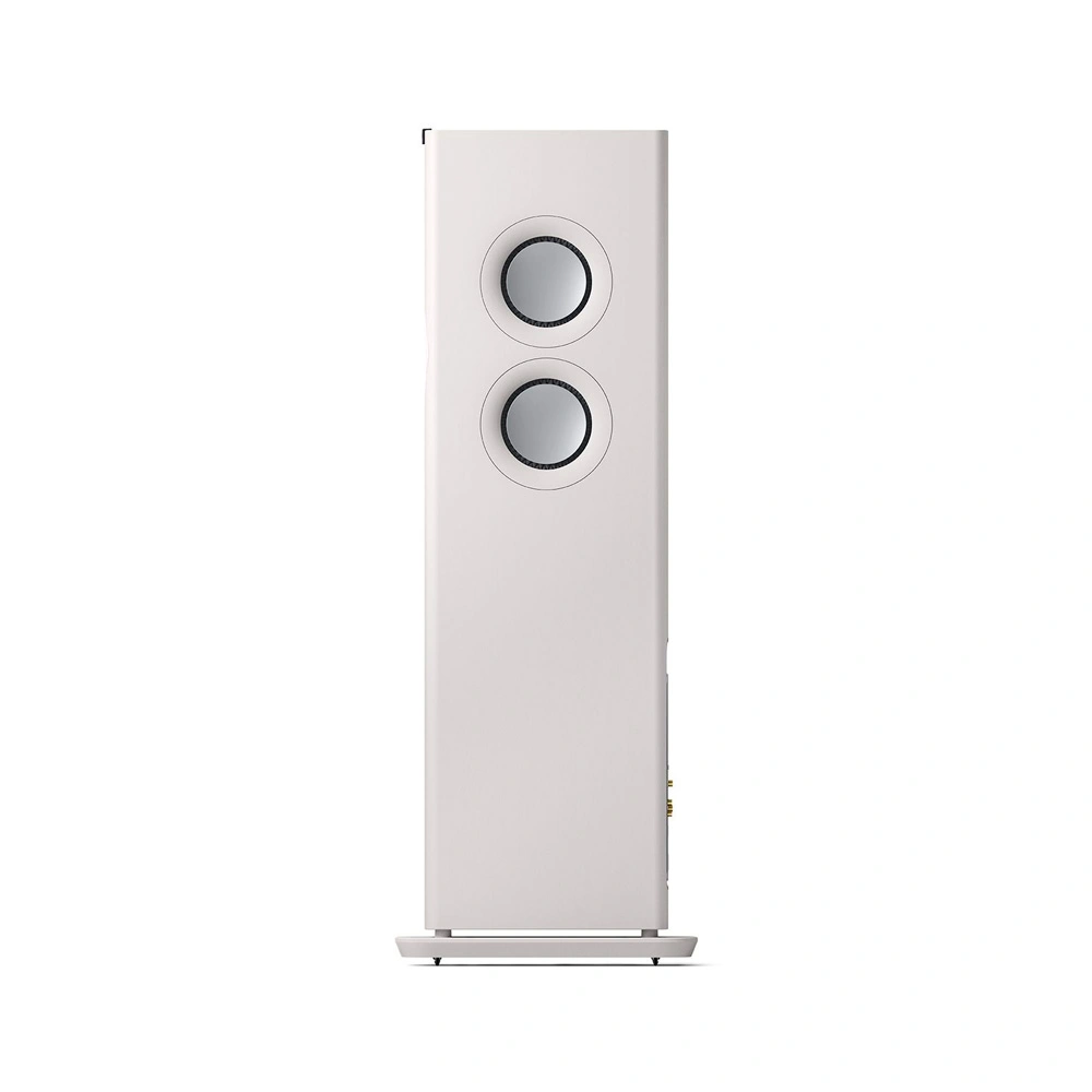 The total output power of the KEF LS60 Wireless speaker system is an impressive 1400W. The LS60 Wireless comprises a leading speaker (which houses all the connecting components) and a slave speaker, both of which are active and equipped with DSP and three amplifiers: Class D for low and mid frequencies and Class AB for the tweeter.