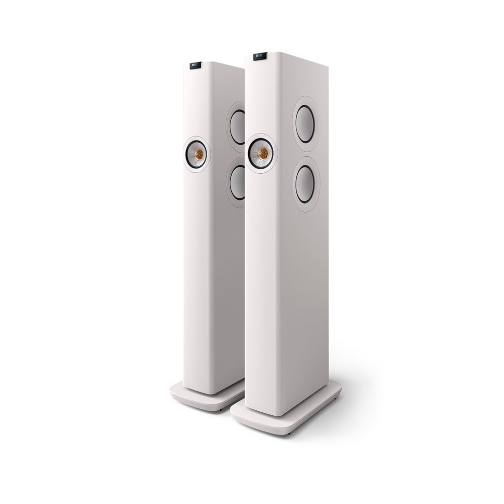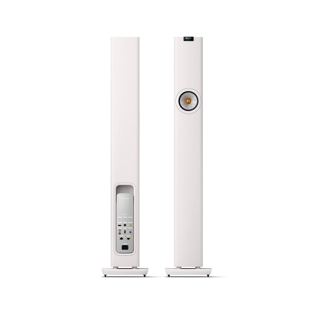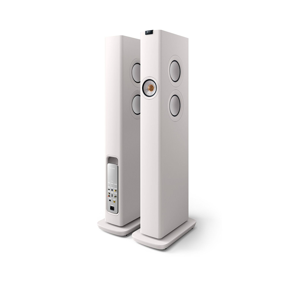The total output power of the KEF LS60 Wireless speaker system is an impressive 1400W. The LS60 Wireless comprises a leading speaker (which houses all the connecting components) and a slave speaker, both of which are active and equipped with DSP and three amplifiers: Class D for low and mid frequencies and Class AB for the tweeter.