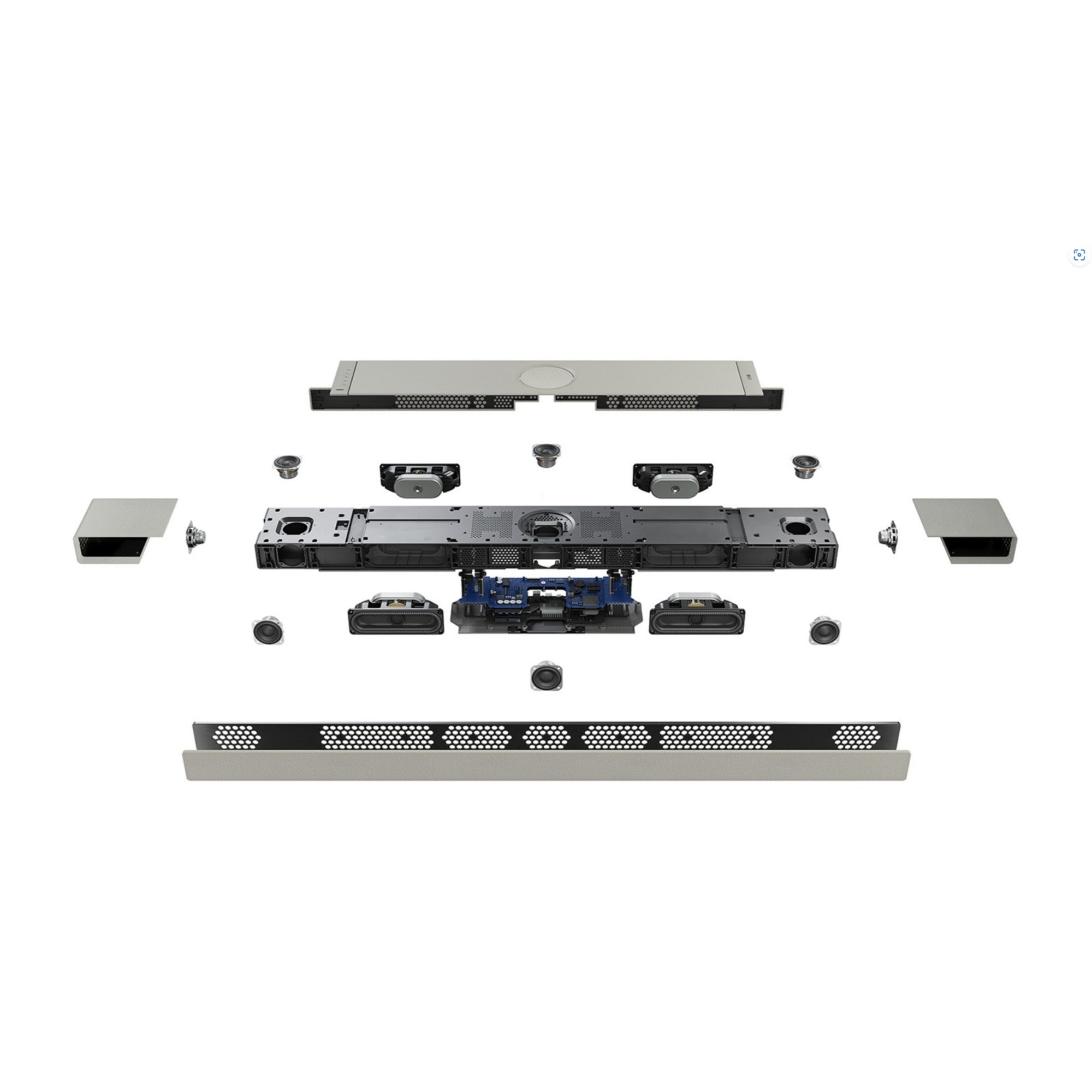 The KEF XIO soundbar is equipped with six Uni-Q MX drivers, a compact version of KEF's well-established UniQ array designed for even sound distribution throughout the room. The low-frequency output is handled by a pair of P185 LF drivers using P-Flex suspensions arranged in a force-canceling configuration to reduce vibrations and housing distortions.