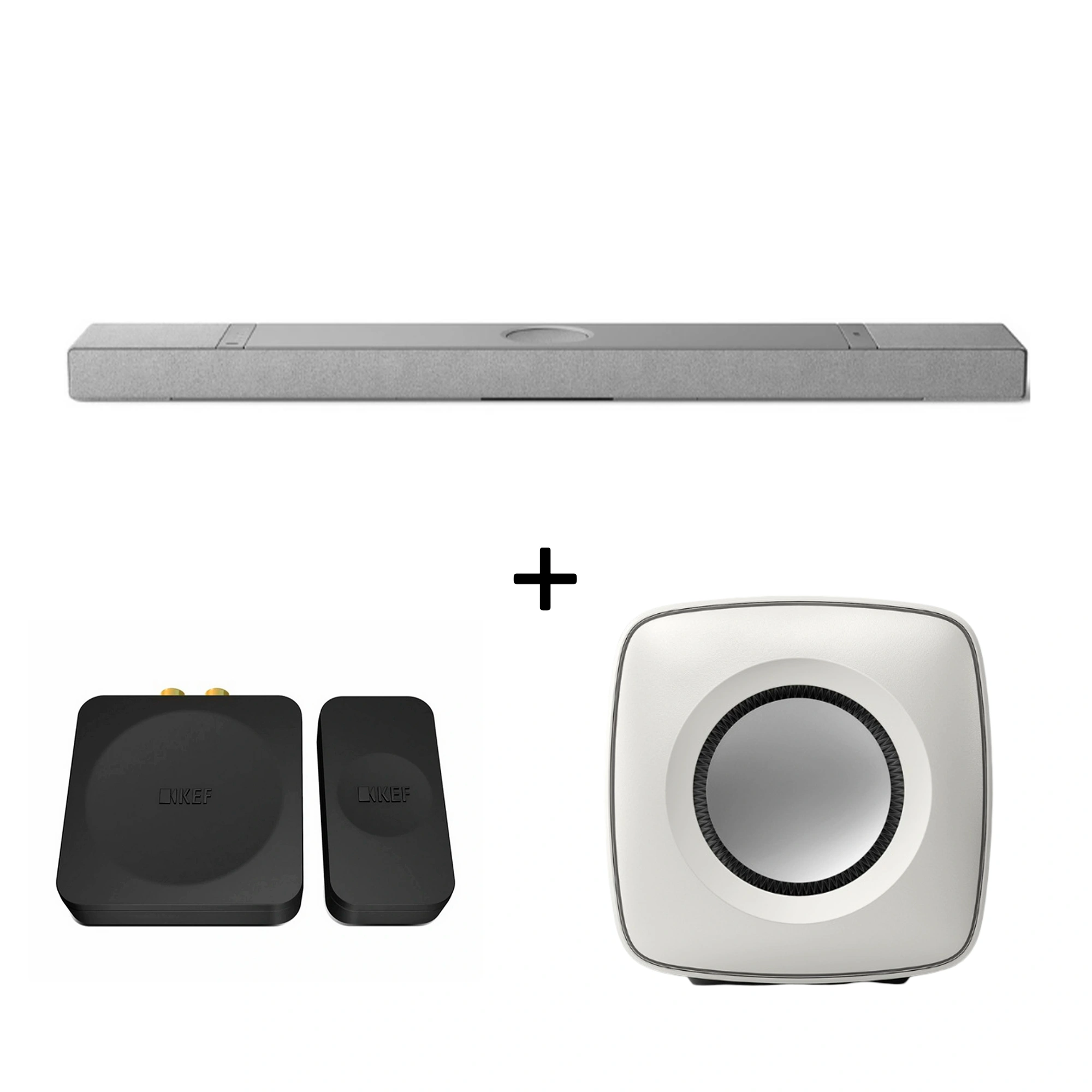 Expandable subwoofer capability with an additional KW2 RX receiver which provides wireless pairing with compatible KEF subwoofers. The KEF XIO soundbar features an aluminum top plate and fabric cover. It is available in Slate Black and Silver Grey colors, with the option to mount on a shelf or wall. Despite its slim profile, the soundbar is designed to provide relatively extended bass response through internal low-frequency drivers.