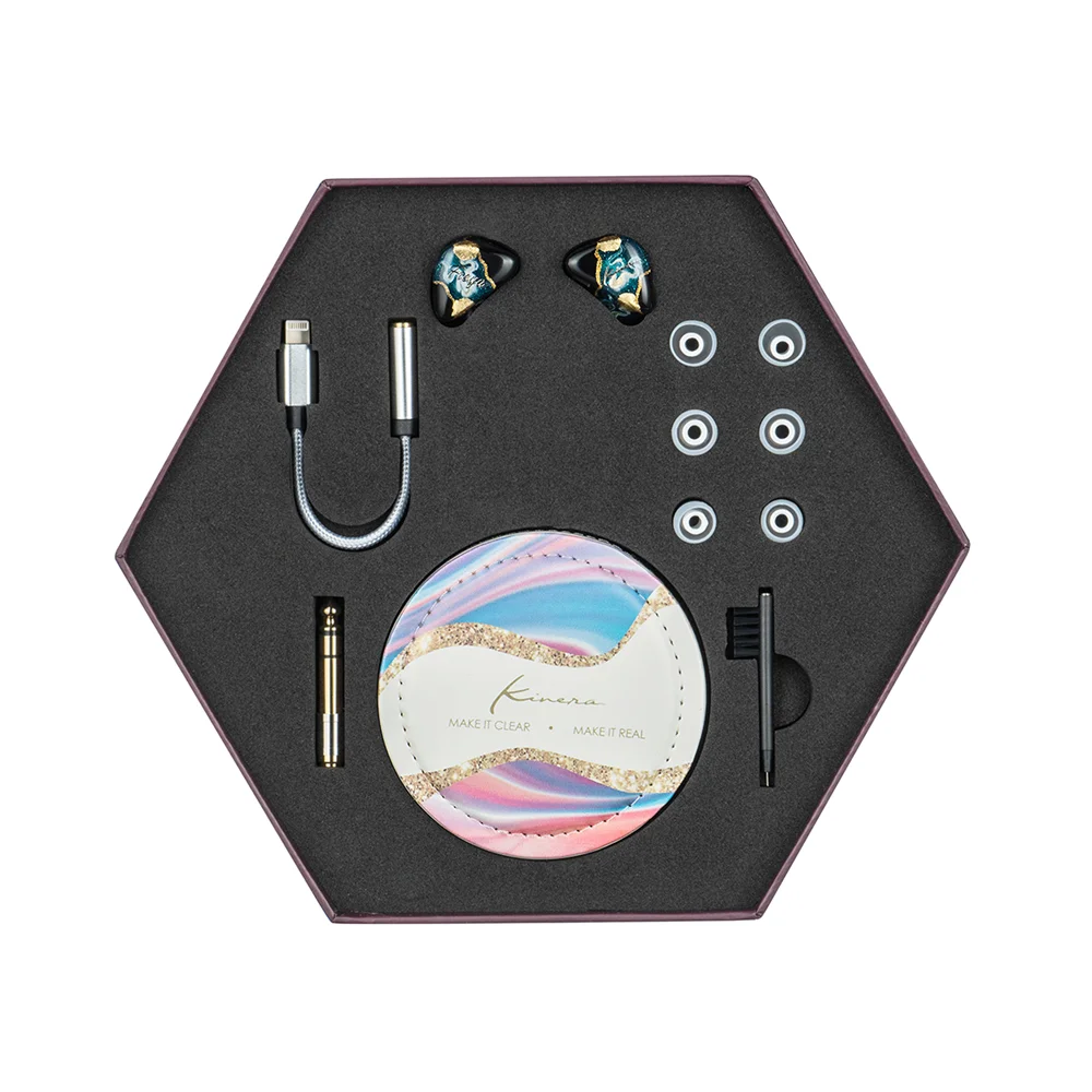 The 7mm Kinera dynamic driver delivers deep and rich bass reproduction. The dual Knowles RAF-32873 balanced armature drivers offer incredible clarity in midrange frequencies and vocals. The custom-made Kinera BA 30095 driver handles extended high frequencies, providing crispness, airiness, and elegance. A precisely tuned crossover guarantees natural, crisp, and well-defined low, mid, and high frequencies.