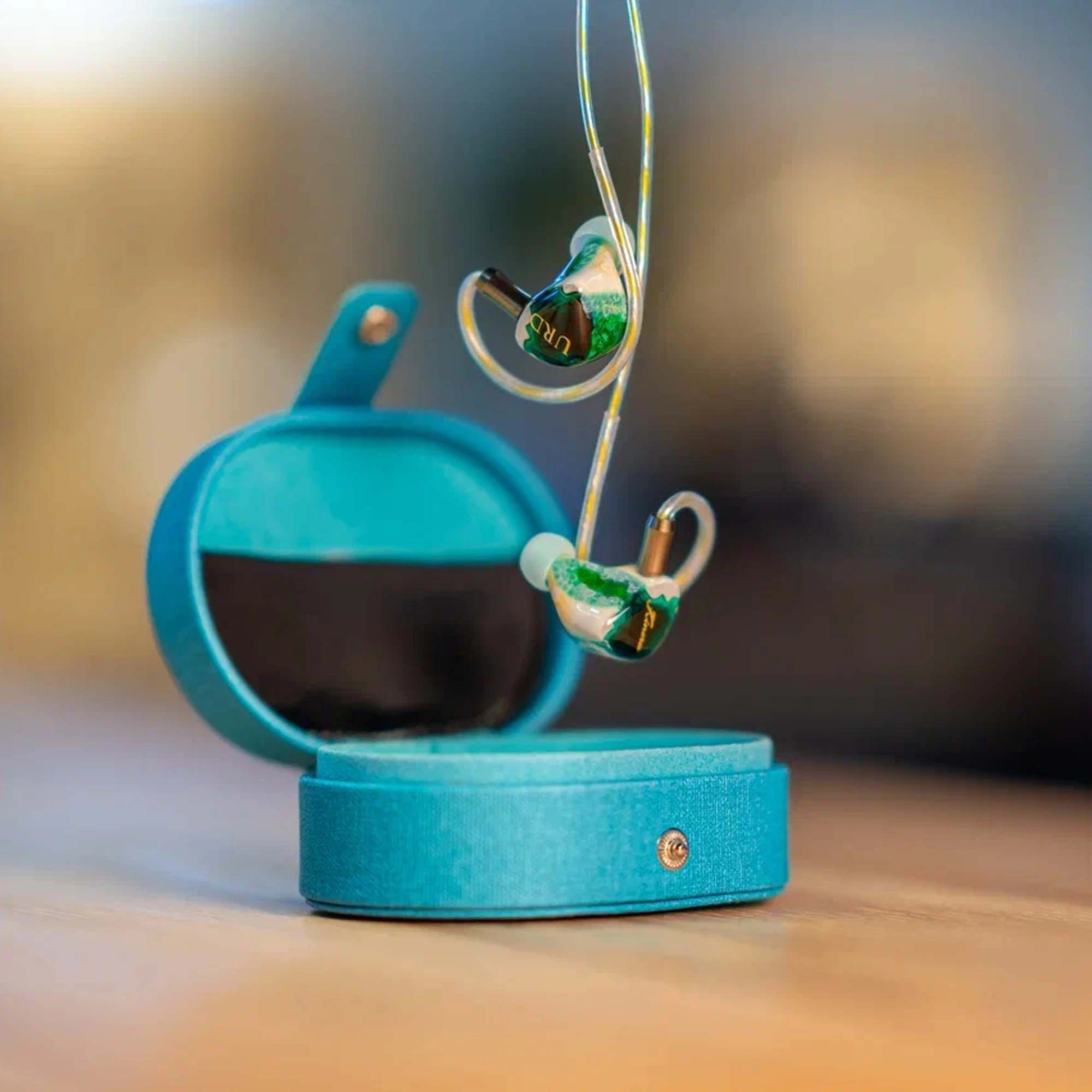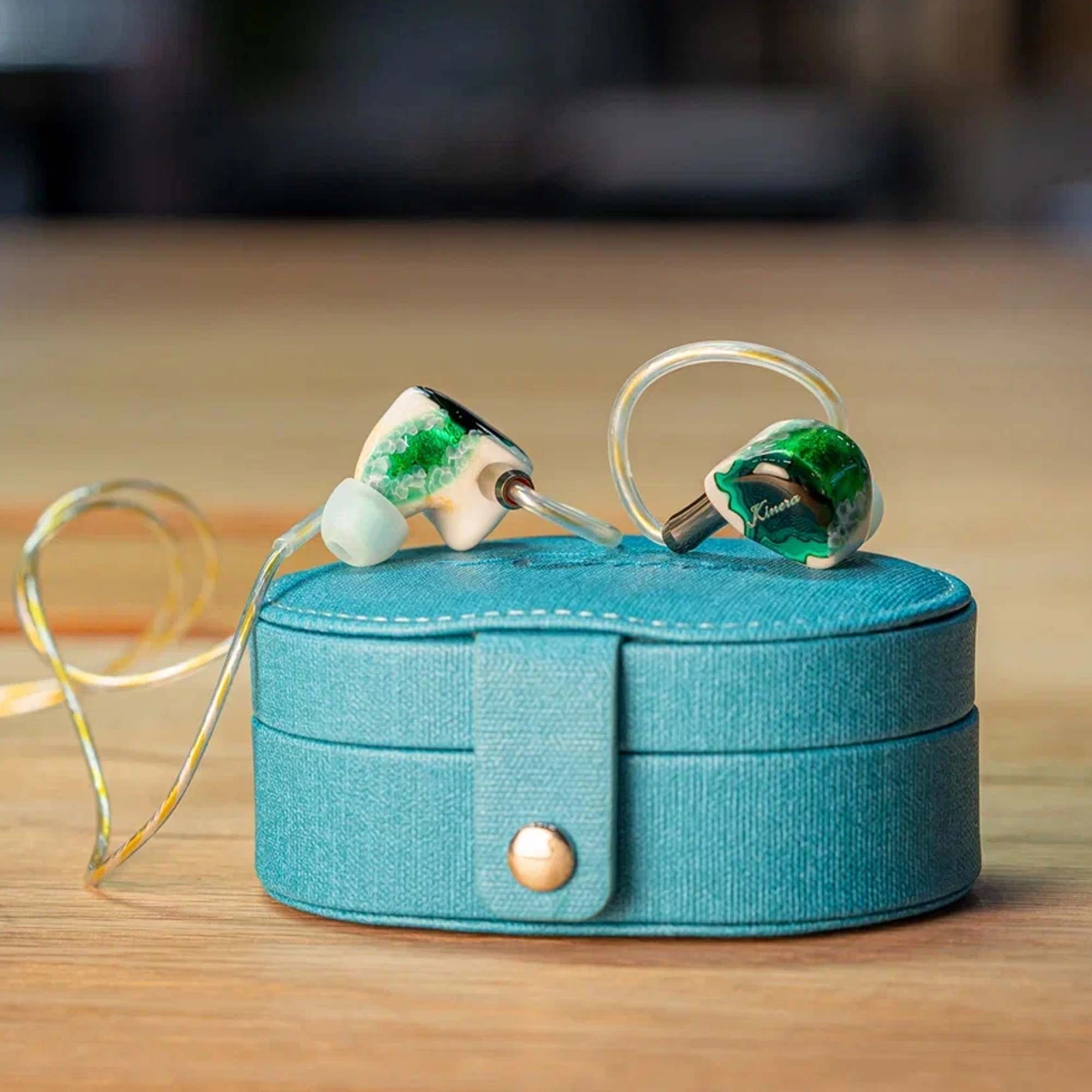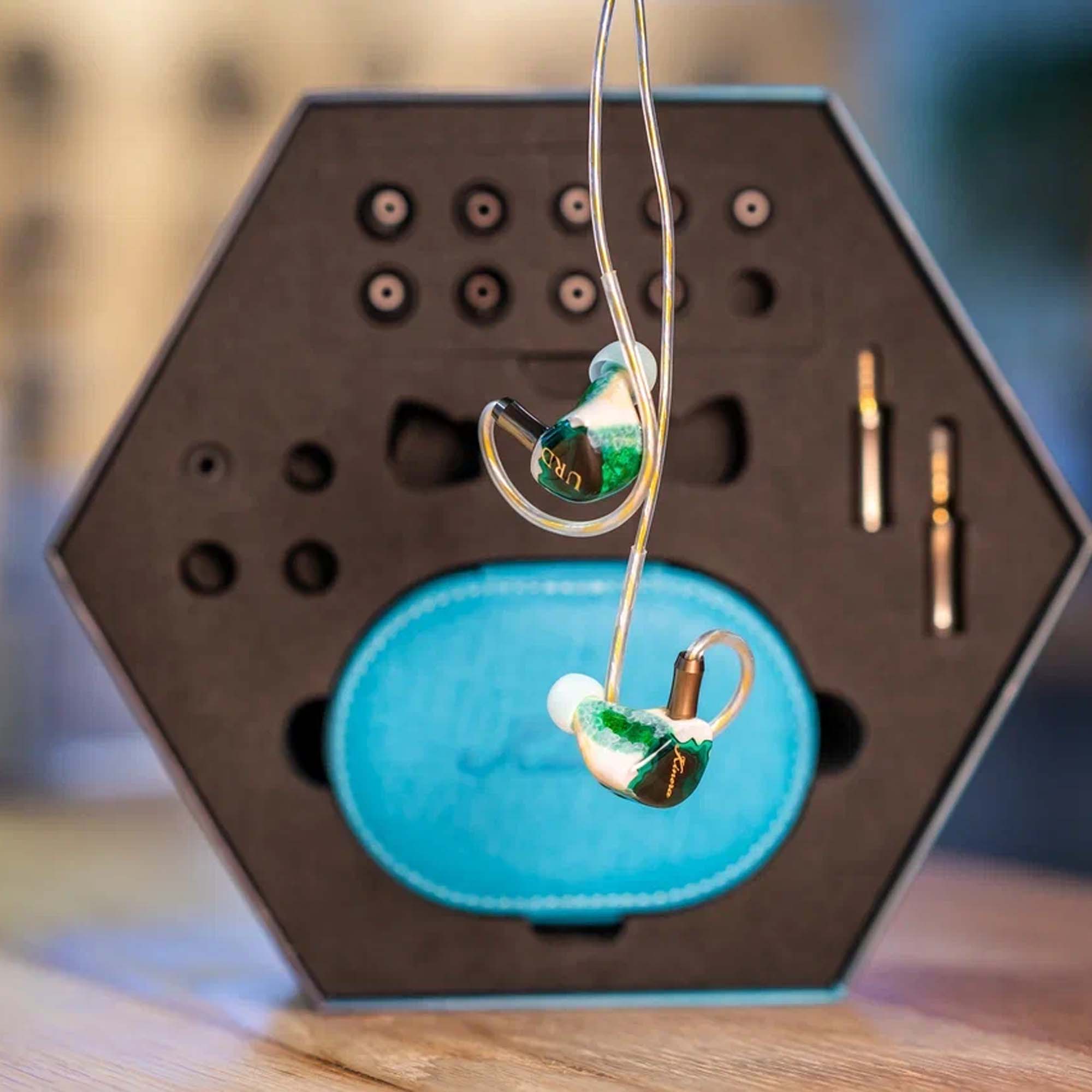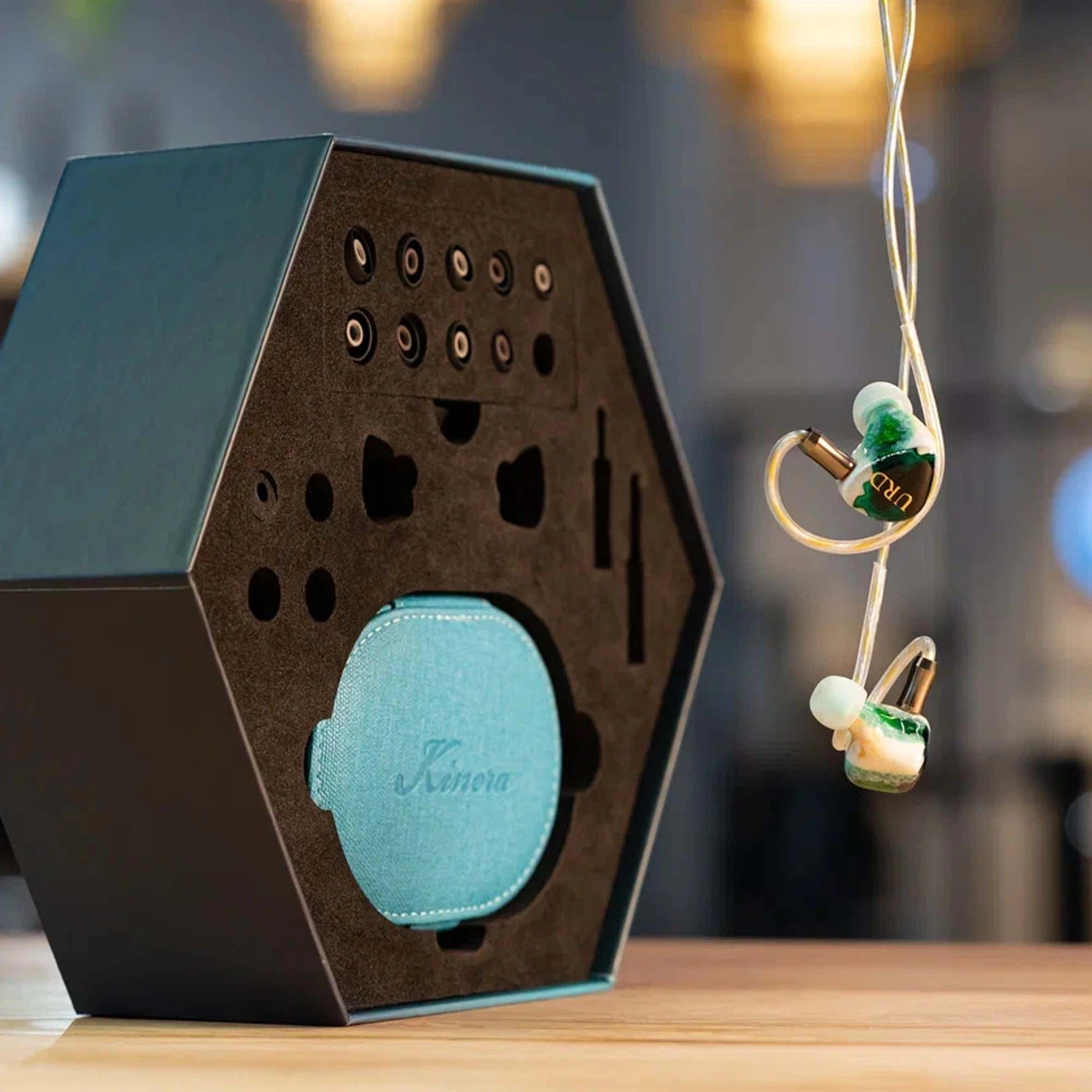 The faceplate represents the surface of a lake, and 3D printing is used to create a recess in the middle of the faceplate. The finished faceplate design represents the water surface of the "URD Well," which nourishes the World Tree. The earphone housings, already familiar, are hand-painted by a professional artist. The base colors used are white and green, with elements of stone texture and unique abstract landscapes. Each earphone proudly displays gold Kinera and URD lettering.