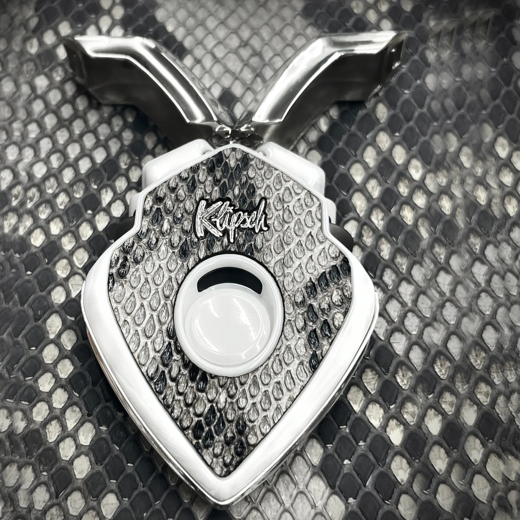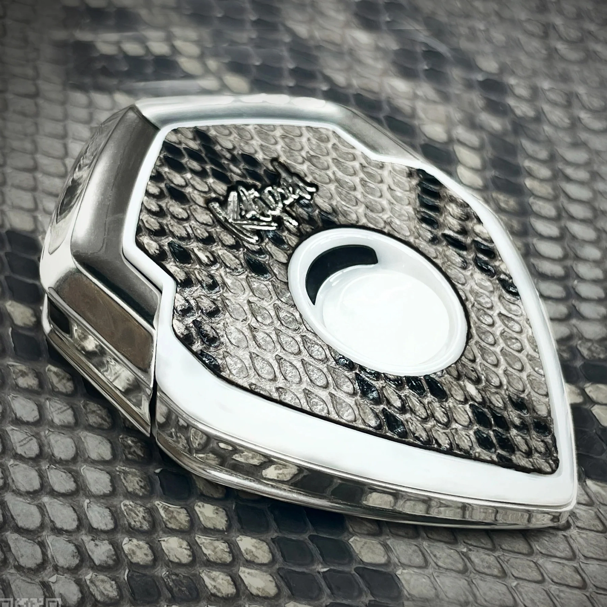 The striking Pitone d'Argento features silver bullet and charcoal gray toned white python, accentuated by 925 sterling silver doors and frame.