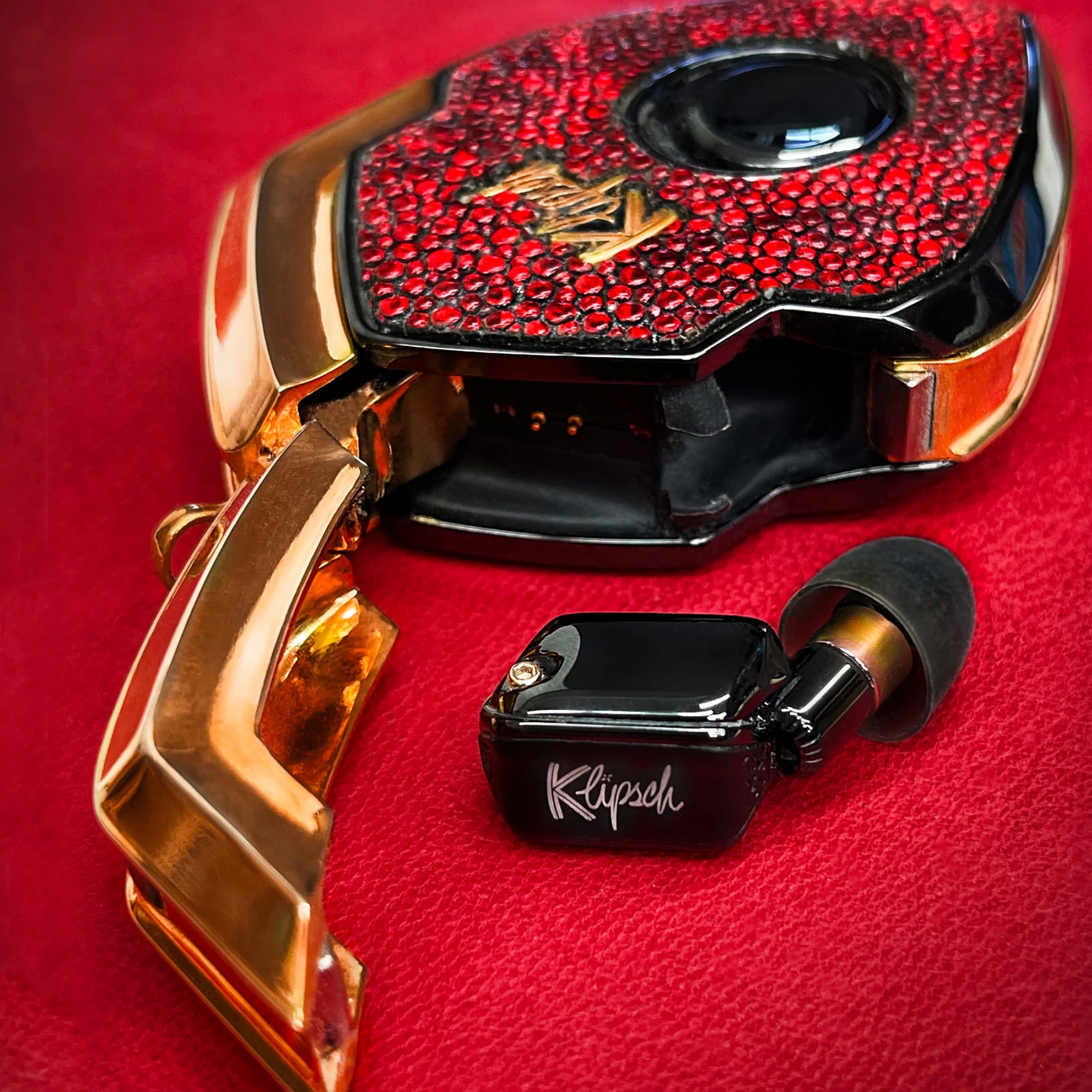In the barren desert of true-luxury audio, the brilliant T10 Bespoke shines bright. The Ruby in the Rough radiates the warmth, style, and sophistication of true-luxury audio accentuated by ruby-red genuine stingray covers and 24K gold plating.
