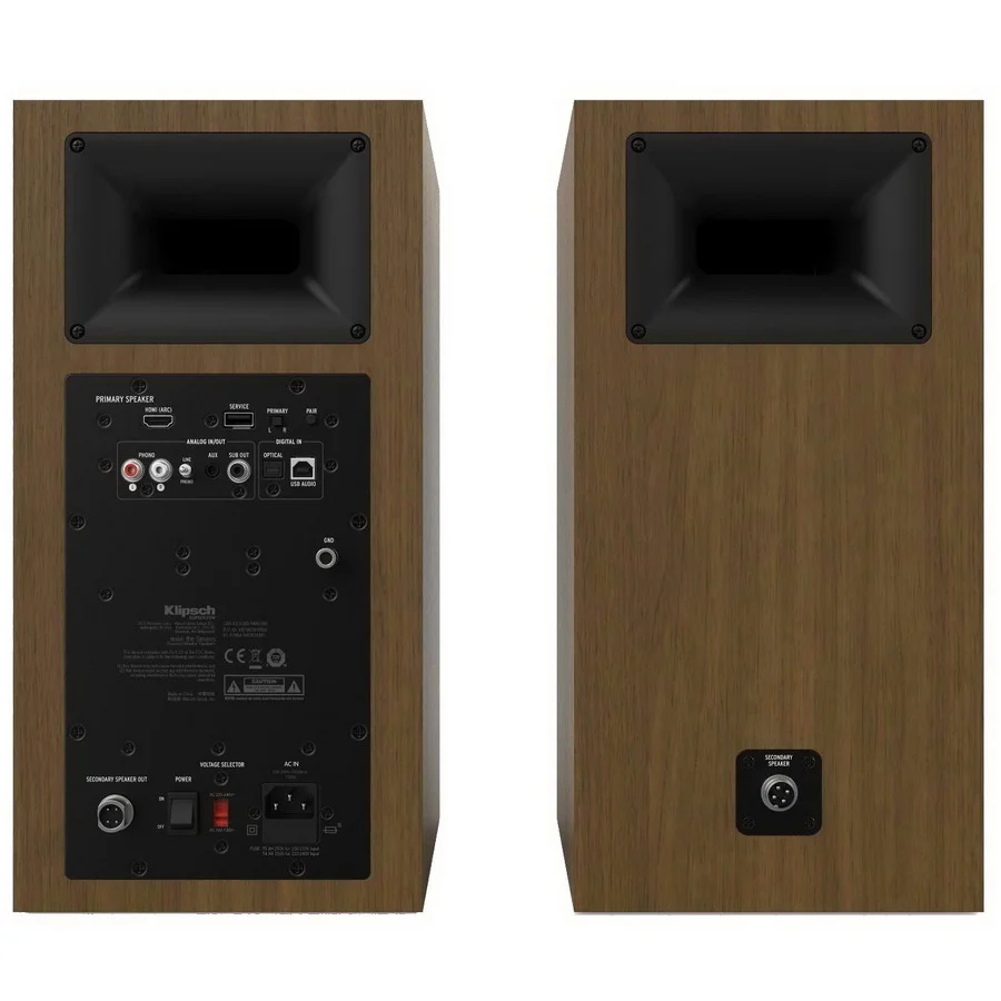 The active speakers feature low-noise D-class amplifiers, providing 100 W per channel (bi-amping connection, two 60-watt for mid/low drivers and two 20-watt for tweeters). The passive speaker connects to the active one using a special cable with 4-pin connectors. The Klipsch The Sevens also include an MM phono preamp for connecting turntables, a high-performance DSP processor, dynamic bass EQ for bass enhancement, and a DAC supporting PCM up to 24-bit/192 kHz via USB input. The model also features a Bluetooth receiver with AAC and aptX HD codec support for wireless audio streaming from Bluetooth devices.