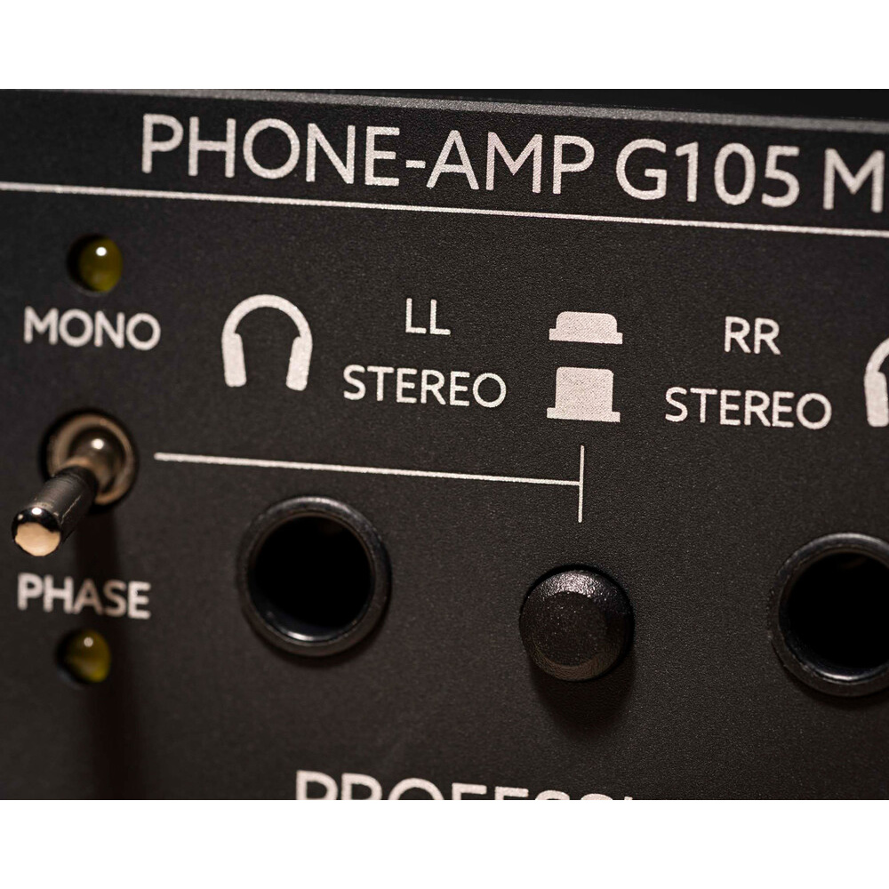 The inputs of the G105 MKII are located on the rear panel and feature electronically balanced XLR connectors. On the front panel, there are two knobs for controlling the level and balance. This amplifier comes with two 6.3mm headphone outputs, and the split switch allows you to optimize them for mono signals if needed.