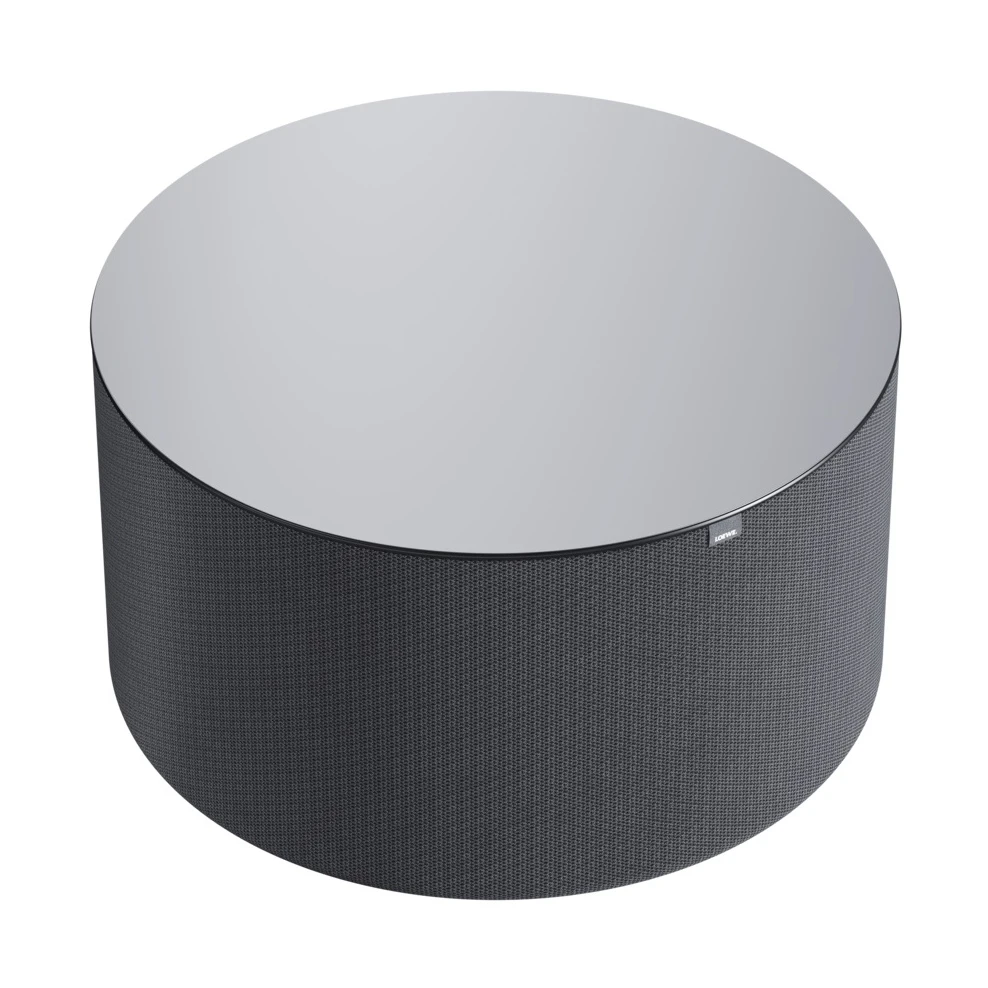 The lacquered stainless steel plate covers the top of the subwoofer and simultaneously suppresses any interfering effects due to its mass. Special durable acoustic fabric made of two threads creates a vivid visual plasticity. Power connections and level controls are discreetly located on the bottom and rear panels. The Loewe system color - basalt gray and the typical Loewe flag complement the harmonious 360° design.