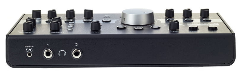 This device allows for the connection of up to four audio sources. It features two combo jack/XLR microphone/line/instrument inputs equipped with Onyx preamps, phantom power, and can be used as the 1/2 input source. The 3/4 and 5/6 inputs are available on four 1/4'' Jack TRS connectors, which can accommodate balanced or unbalanced audio signals. The 5/6 input is also duplicated on a 1/8'' Jack TRS connector located on the front panel. In addition, the USB interface can serve as a source of audio, offering two inputs and four outputs. Source selection buttons are located on the main panel. The centerpiece of this device is the large aluminum volume knob with extremely smooth operation. Convenient Mute (silencing sound by -60 dB), Dim (reducing sound by -20 dB), and Mono buttons are located next to it, as well as a 16-segment input volume meter that can quickly indicate overload. An additional audio source can be connected through the Aux In input on two 1/4'' Jack TRS connectors.