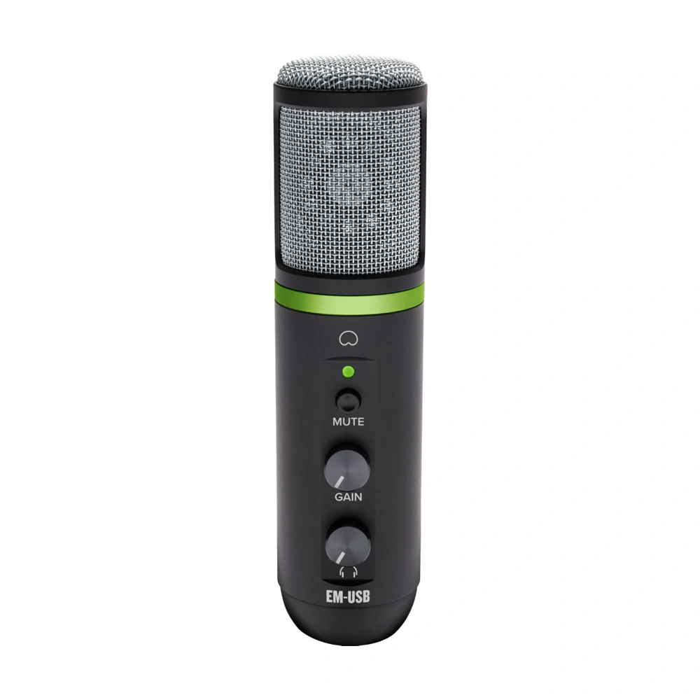 The EM-USB USB microphone is equipped with a large 14mm condenser capsule that provides rich and linear sound across the frequency range from 30Hz to 18kHz. The model has high sensitivity even to low volume sounds and can withstand sound pressure levels of up to 130dB. The built-in ADC and DAC have wide dynamic ranges of 89dB and 93dB, respectively. The cardioid polar pattern suppresses side and rear signals, resulting in a clear and articulate tone. The front panel features two knobs for gain levels and headphone output volume, which is located on a 1/8" TRS jack. There is also a mute button and a status LED.