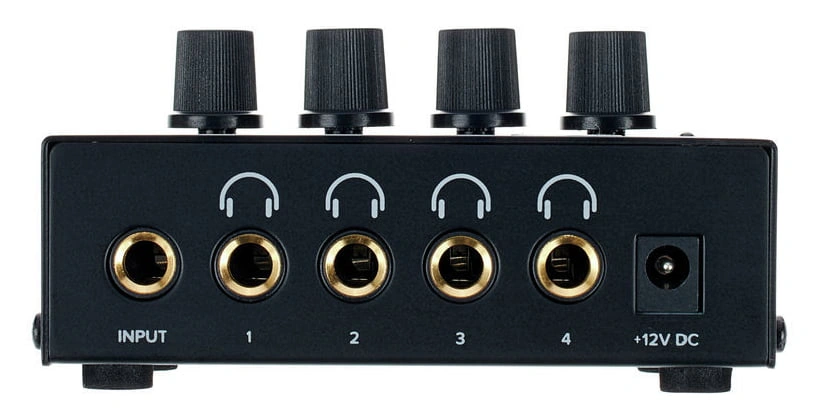 The amplifier has one stereo input on a 1/4 inch TRS connector and four stereo outputs on similar connectors. With these connectivity options, you can send audio from a stereo source to four different pairs of headphones.
