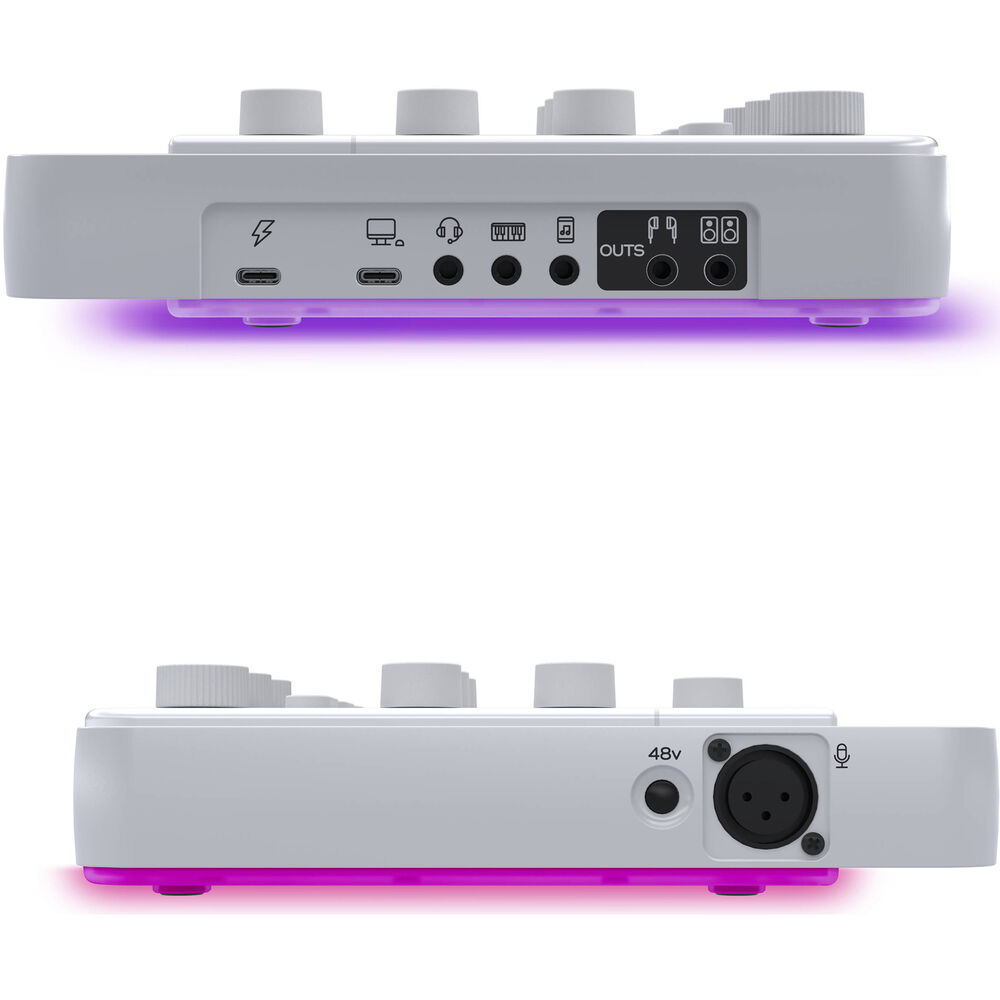 The MCaster Live includes a variety of features such as dedicated headset and media player inputs, USB connectivity, an XLR mic input with phantom power, and user-selectable RGB lighting that looks amazing in any streaming setup. If you're on the move, just plug in an external USB battery pack and you're good to go with an incredible mobile streaming platform.