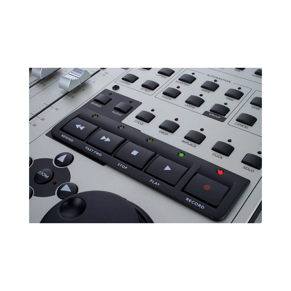 Motorized touch-sensitive fader, LED signal presence indicator. It also has a master fader, jog/shuttle/scrub wheel, separate controls for transport functions, cursor, automation, and functional modes.