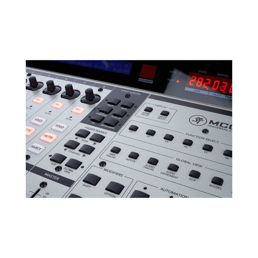 The LCD display (with backlighting) has two lines of 55 characters for parameters and level indication, a two-character LED display for channel settings, a ten-character LED display for timecode. Expansion is possible using MCU XT devices (eight channels, like MCU, but without the master section) and Mackie Control C 4.