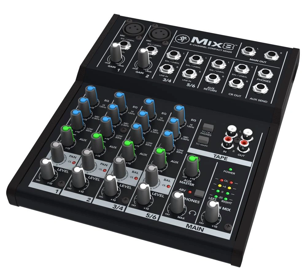 The Mix8 is an 8-channel compact mixer equipped with high-quality components, housed in a sturdy metal casing, and specially designed for a variety of sound reinforcement applications. The mixer features 2 mic/line inputs with 48V phantom power and 2 stereo 1/4" line inputs capable of accepting dynamic and condenser microphones, keyboards, DJ devices, portable players, and much more. The mic/line inputs have XLR and 1/4" connectors, a 3-band equalizer, aux send, level control, panning, and overload LED indicators. Each of the two stereo 1/4" line inputs also has an aux send, a 3-band equalizer, level and balance controls, and an overload LED indicator.