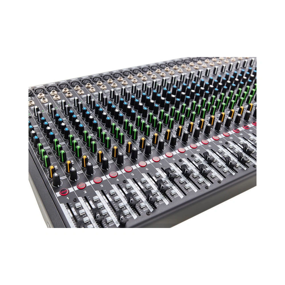 The DSP processor called GigFX offers the user 24 effects, including reverb, delay, modulation, filters, and distortion. The selected preset number is displayed on the built-in LCD screen, and the processor can be remotely turned on and off using an optional footswitch, which has a 3.5 mm input. The built-in USB audio interface has 2 inputs and 4 outputs, 24-bit resolution, and is capable of operating at sample rates up to 192 kHz. Connection to a PC is made via a USB-B port, and the mixer is powered by AC.