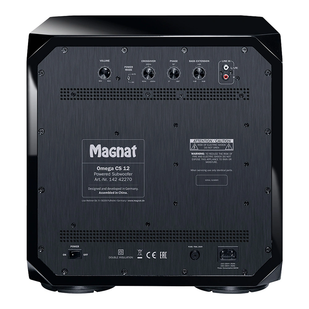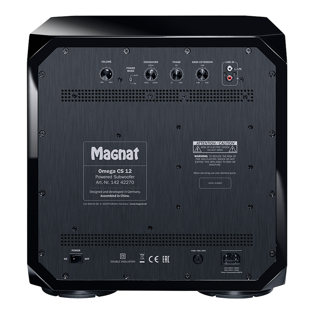 The built-in Class D amplifier operates at a power of up to 525 watts in normal mode and can provide 1,100 watts peak power. The processor is responsible for the frequency response, as well as a set of user adjustments. The Omega CS 12 subwoofer features four control knobs on the rear panel: volume, crossover adjustment, phase, and +8 dB bass boost.