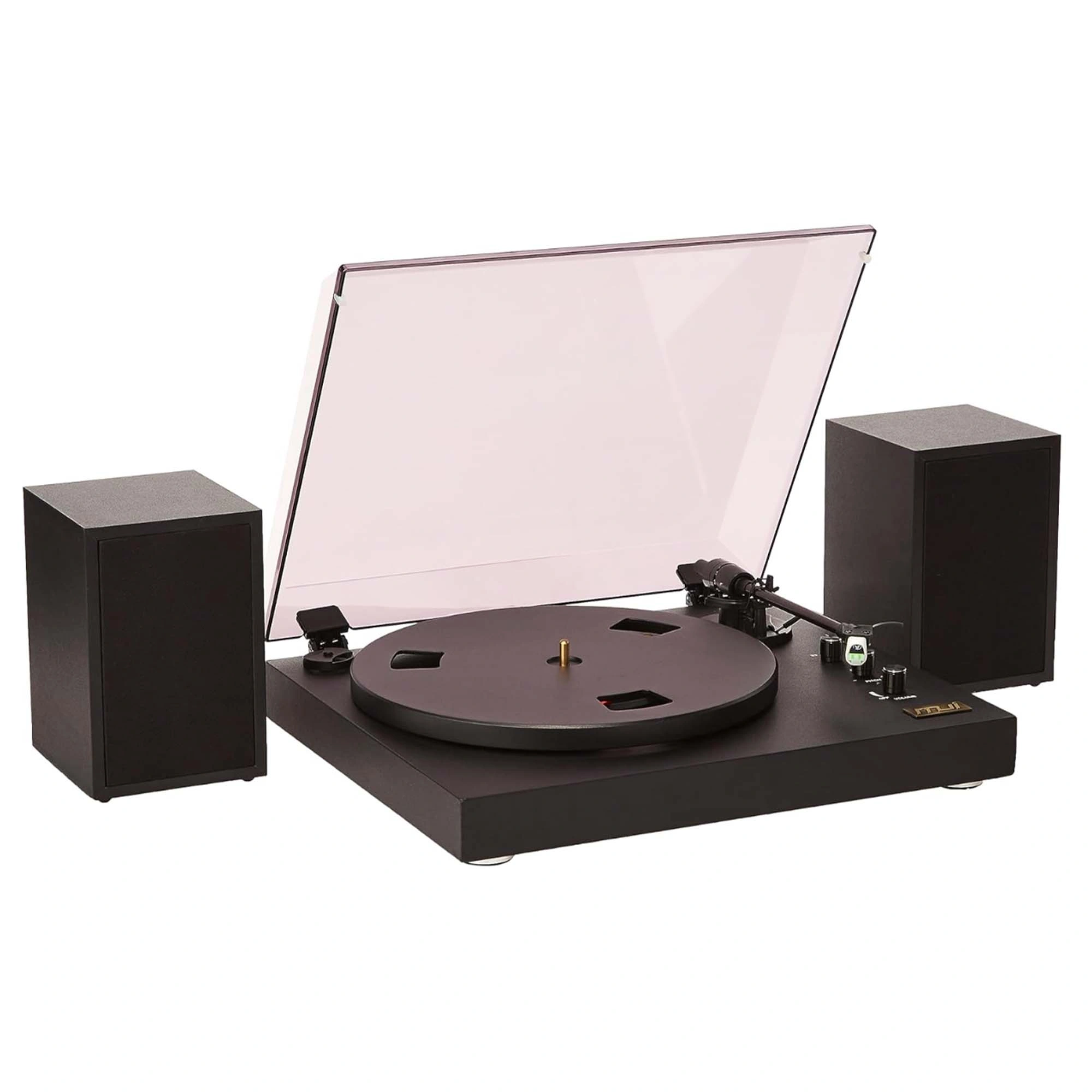 Listen to high fidelity audio on this precision manufactured vintage turntable by MJI. This classic turntable is bolstered by matching dual stereo speakers, maintaining the attractive aesthetic whilst adding subtle power.