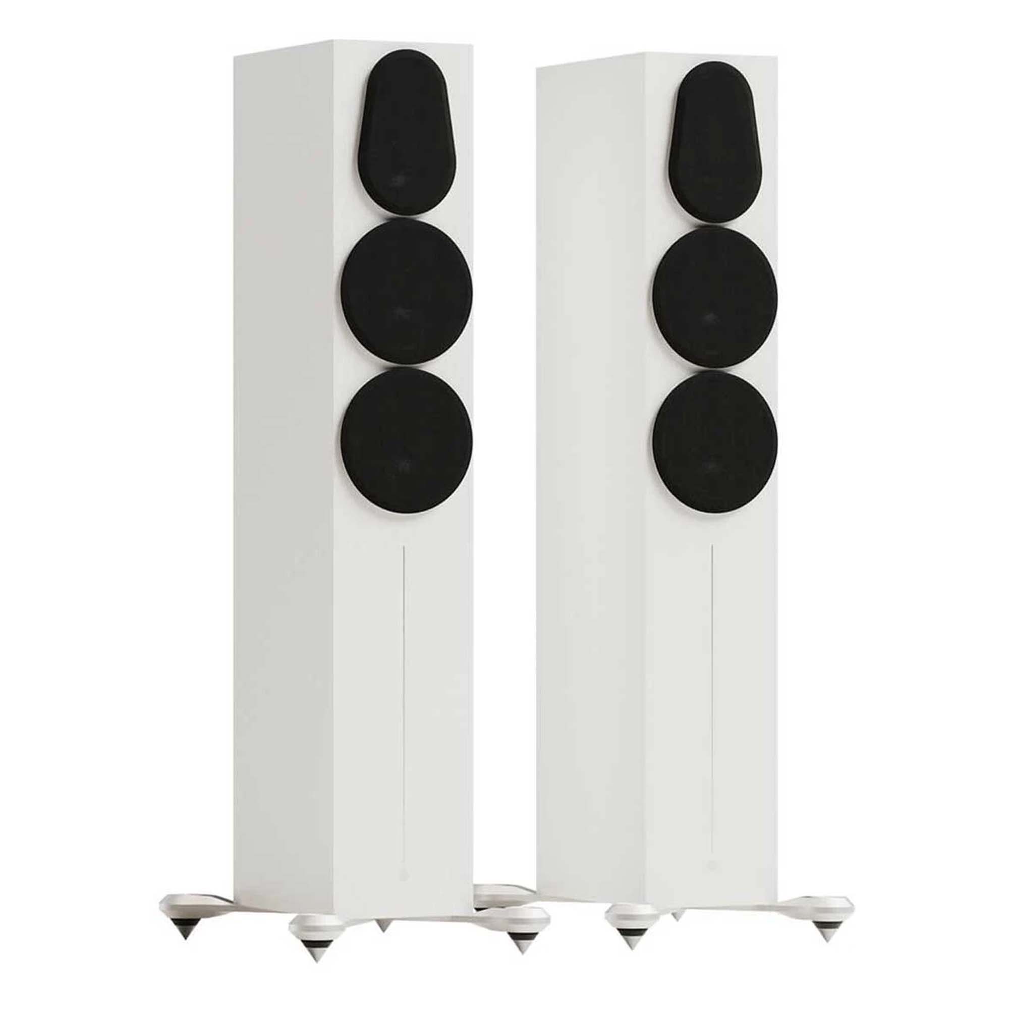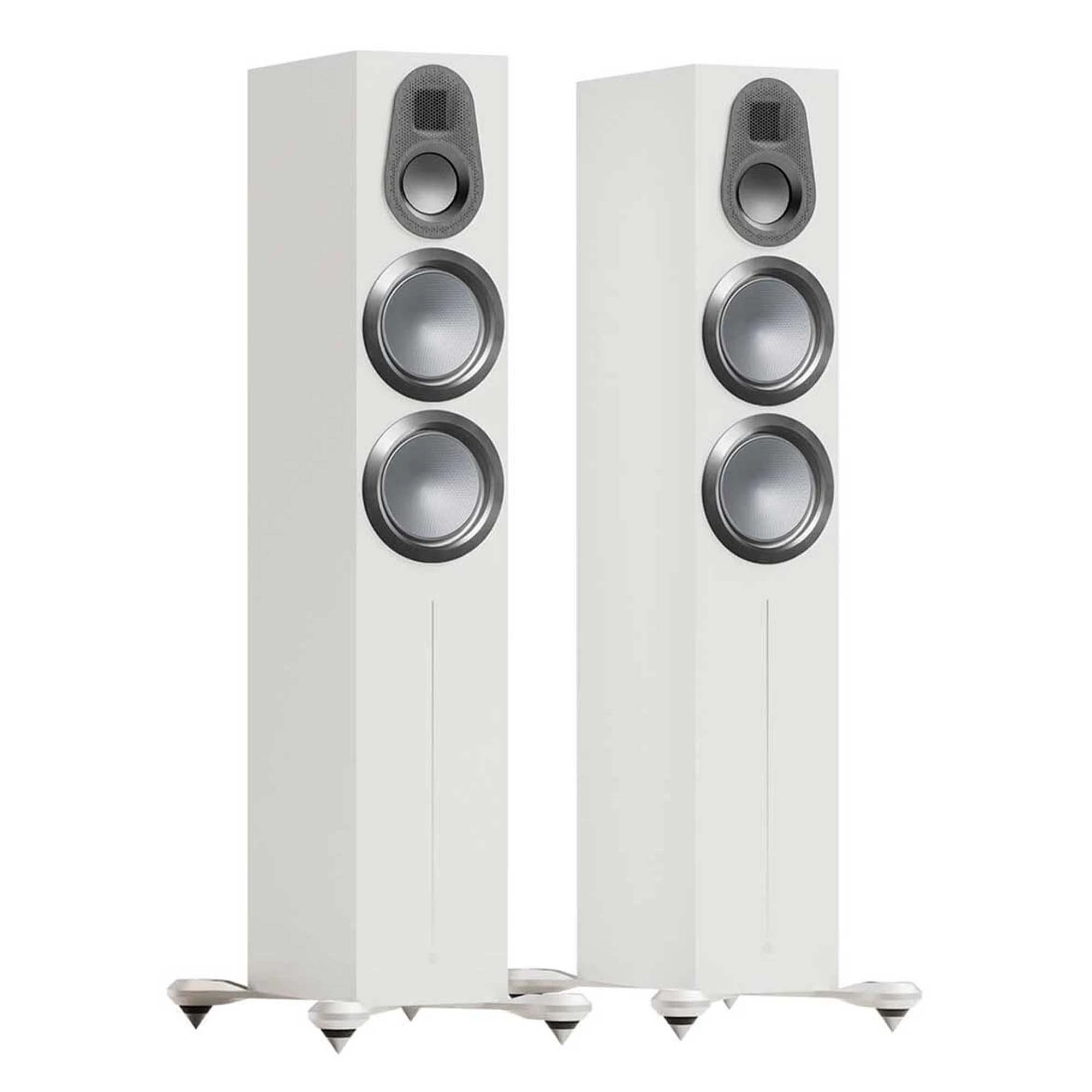The luxurious, soft-touch finish of the Monitor Audio Gold 300 cabinets exudes a premium-class look and feel. The one-bolt-through design technology enhances the mounting strength, rigidity, and driver/baffle disconnection. Custom-made magnetic grilles offer a clean visual style that is practically acoustically transparent. High-quality gold-plated bi-wire terminals are custom-made. Durable cast metal outrigger feet with spikes or rubber feet for carpet or hard floor surfaces provide a more attractive appearance and take up less floor space.