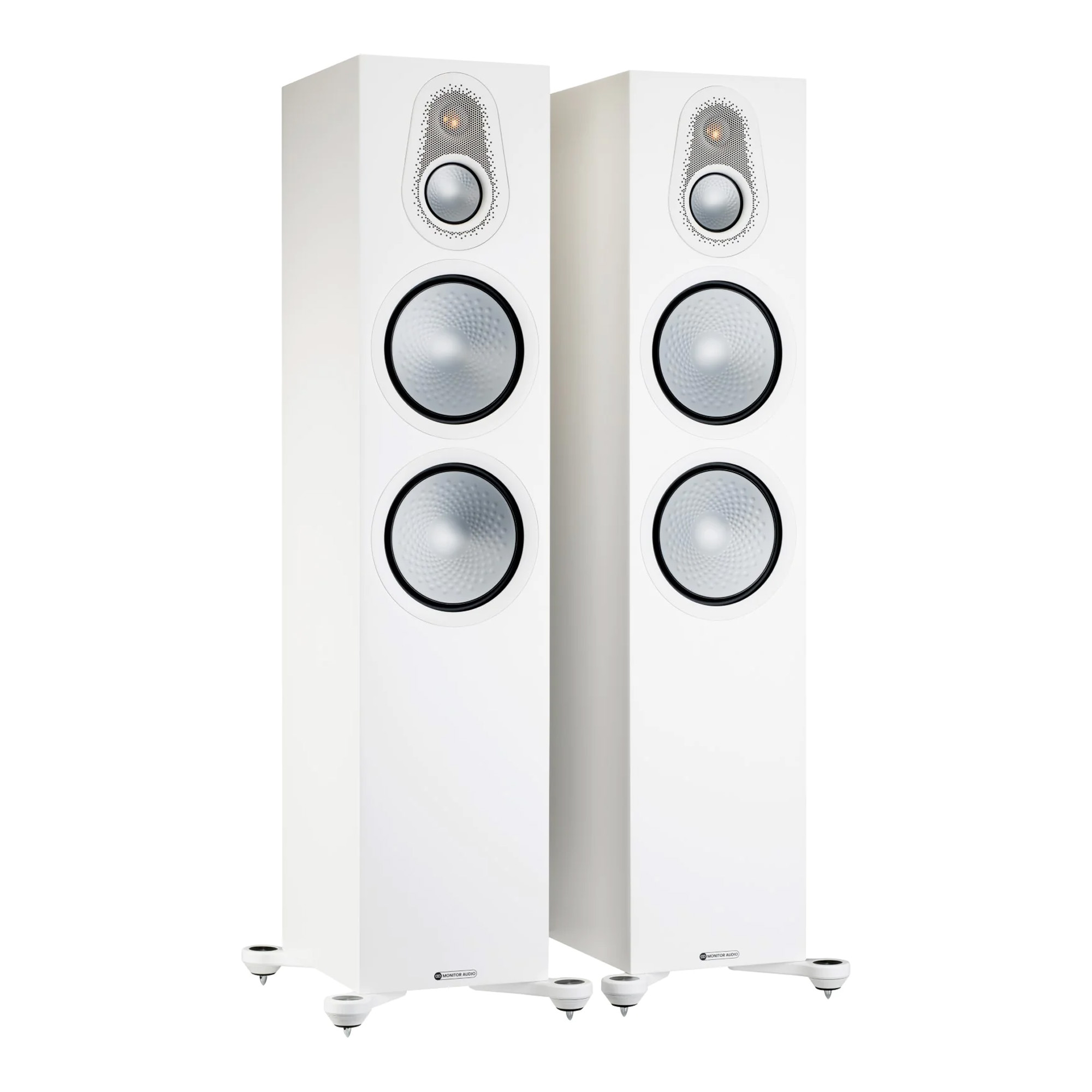 The Monitor Audio Silver 500 7G speakers have a three-way configuration and are equipped with signature drivers. High frequencies are reproduced by a gold dome C-CAM tweeter housed in a Uniform Dispersion waveguide for optimized directivity and increased sensitivity. The speakers also feature a 3-inch midrange driver with a C-CAM diaphragm. Both drivers are mounted on a damped front panel section to protect them from unwanted vibrations. The tweeter is enclosed by a protective grille to prevent accidental damage.
