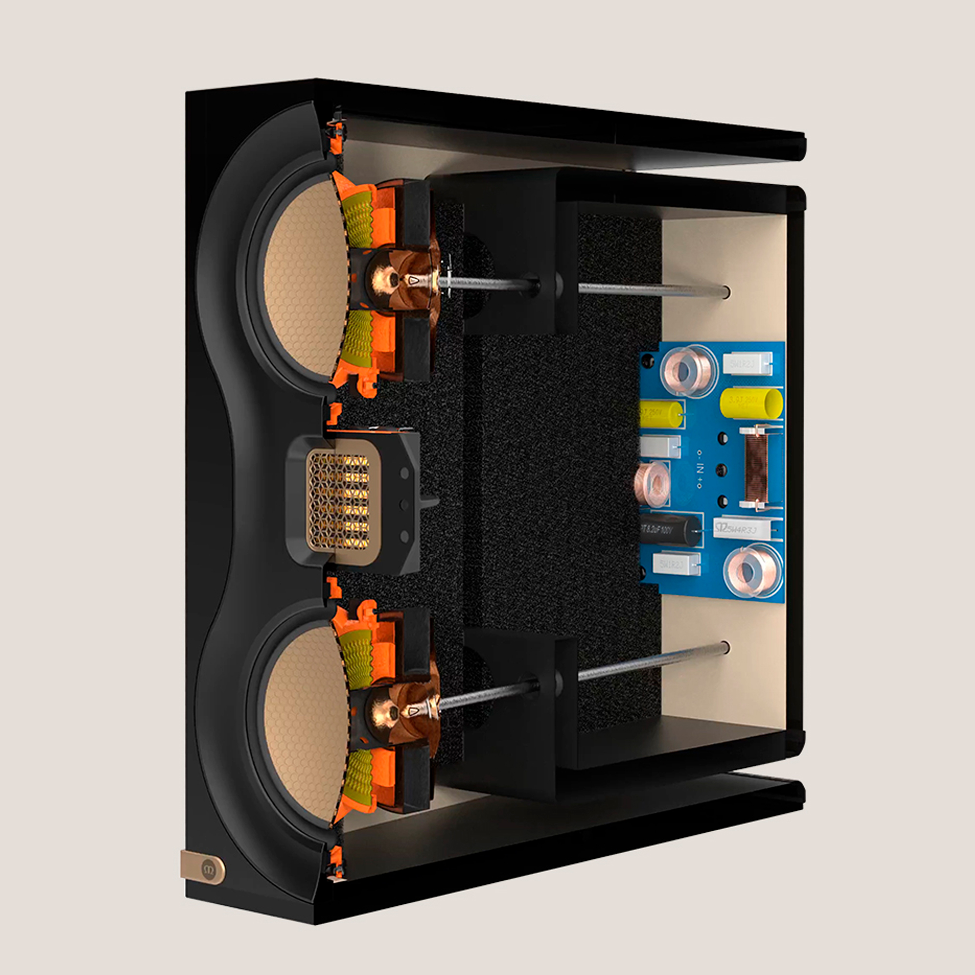 The new generation MPD III ribbon tweeter is located between the bass drivers, offering an extended frequency range for transparent and detailed sound. All three drivers are mounted in a single block, mechanically isolated from the front panel to dampen vibrations and reduce distortions. The drivers are fastened with metal pins on the rear side of the enclosure.