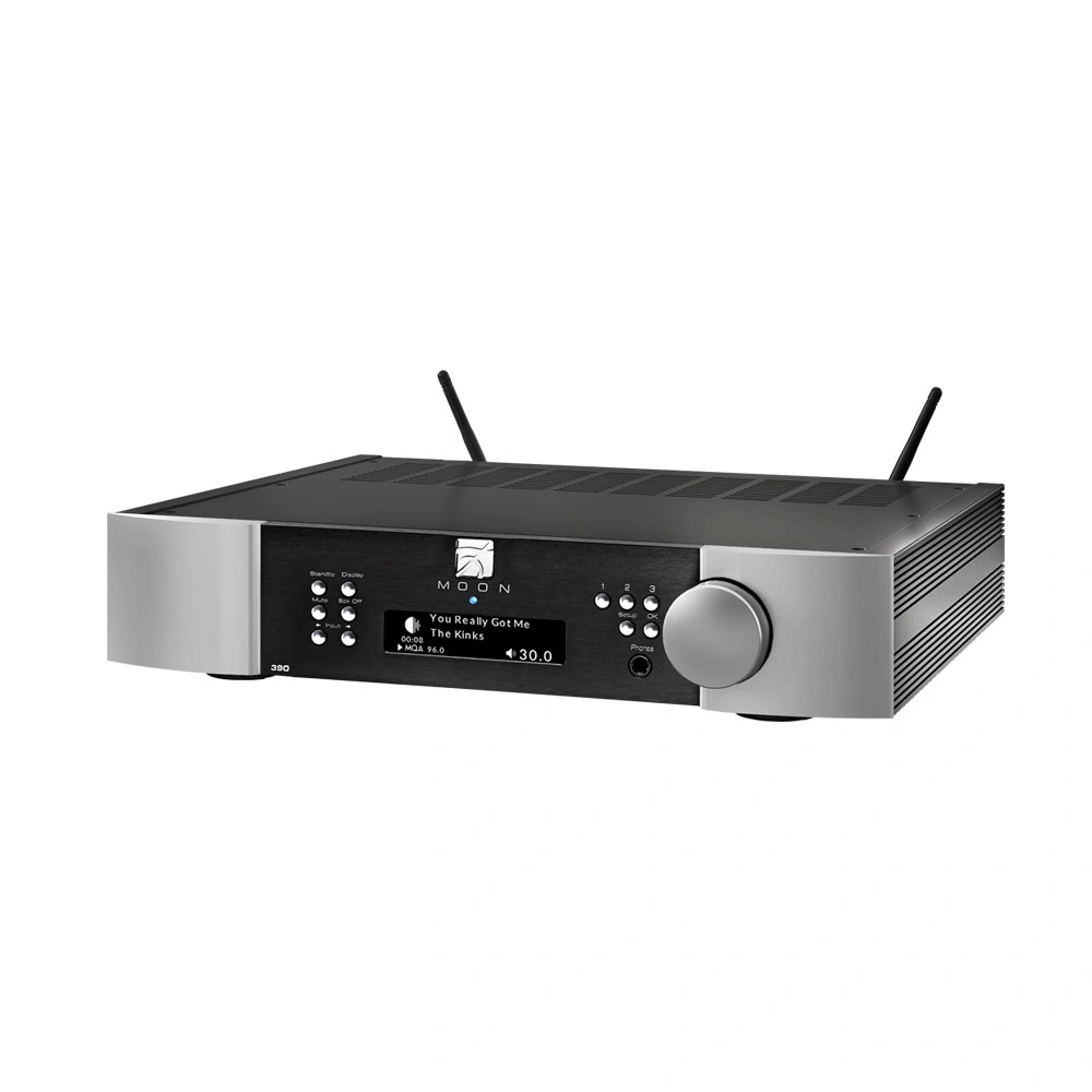 Moon by Simaudio 390 is a network player that houses a DAC, preamplifier, headphone amplifier, phono stage (MM/MC), and streamer. It is based on the 350P preamplifier and the 380D DAC, combining the functionality of these two devices and adding important features such as streaming music from Tidal Masters, Qobuz Sublime+, and Deezer Hi-Fi. The built-in converter supports PCM formats up to 32-bit/384kHz, DSD256, and MQA.