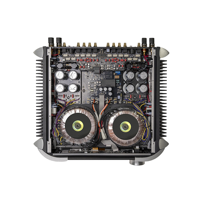 Inside, the meticulously planned circuitry is organized in a symmetrical dual mono scheme, where the left and right channel circuits are completely separated, each with its own power source featuring a dedicated toroidal transformer. This design partly explains the amplifier's substantial weight of 26 kg.
