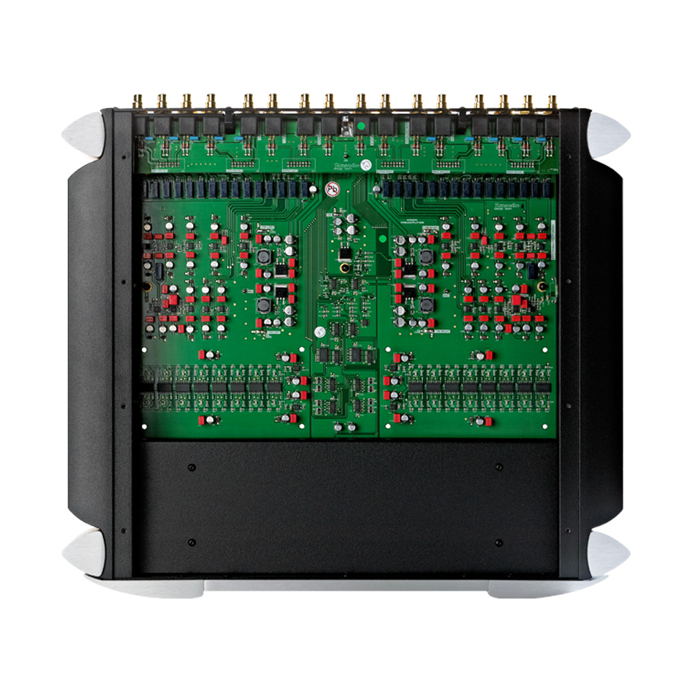 • 2-chassis design with 1 chassis housing the power supply, digital controller circuitry, software processing & the LED display. The other chassis contains ONLY audio circuitry;
