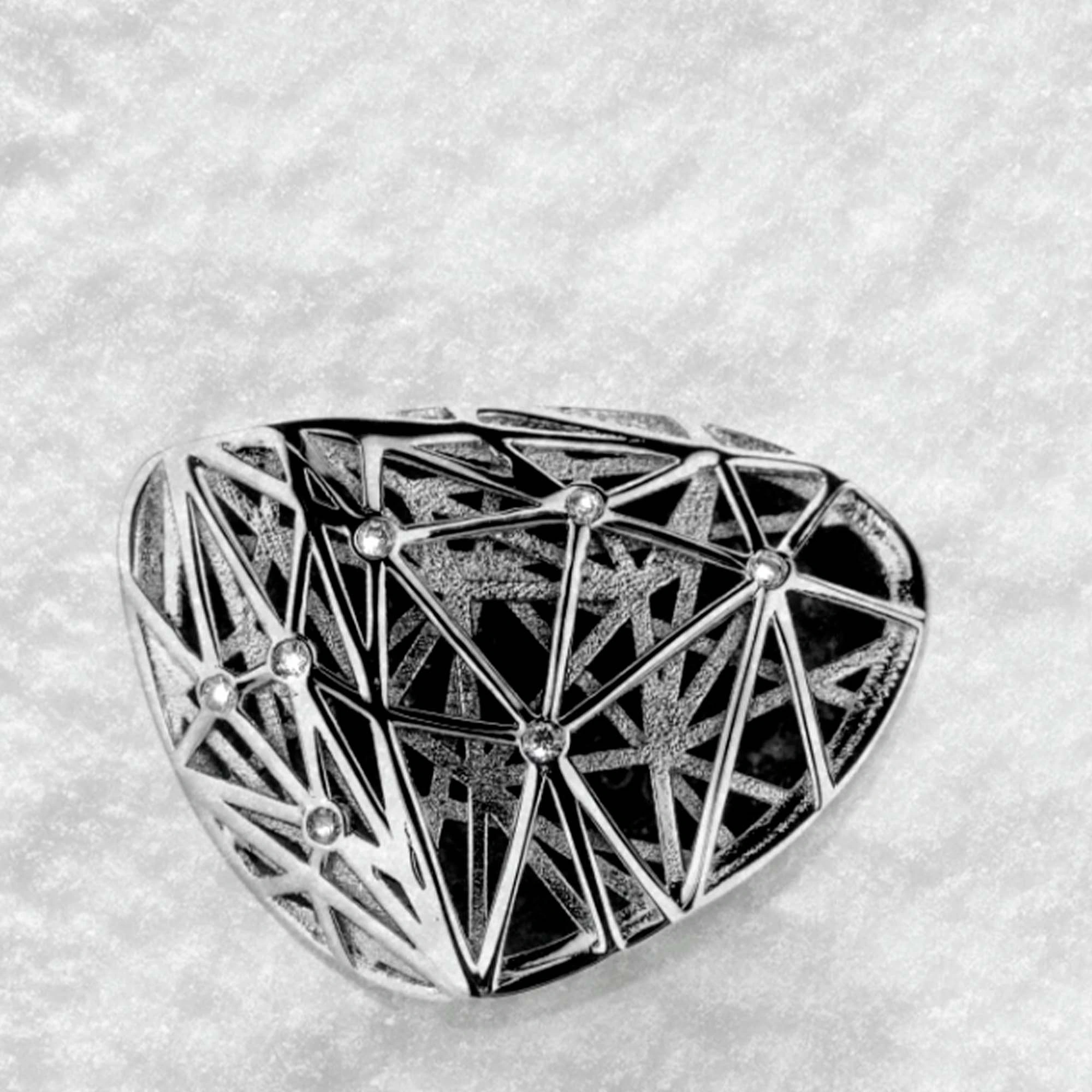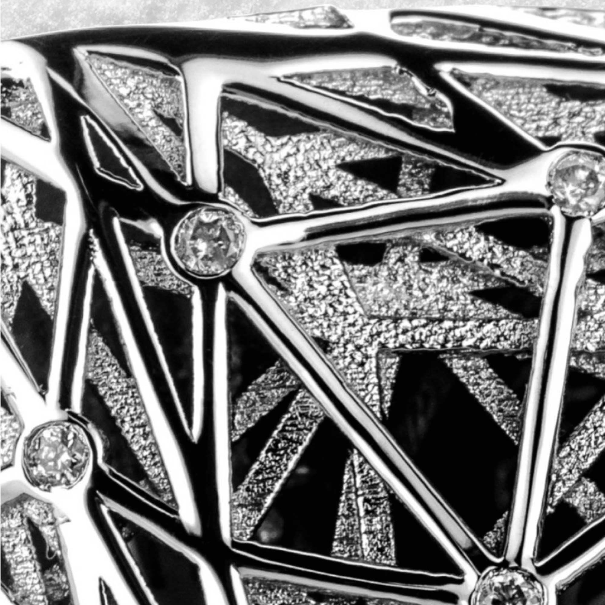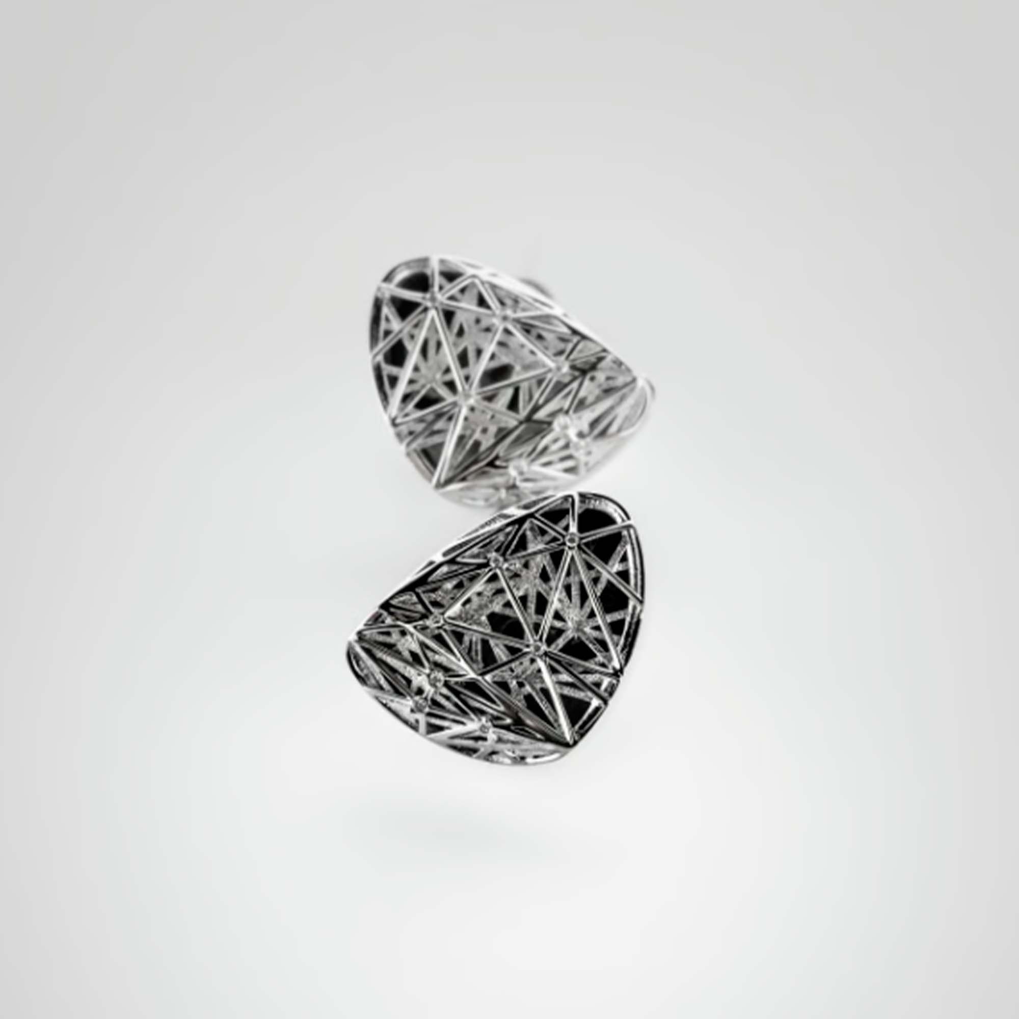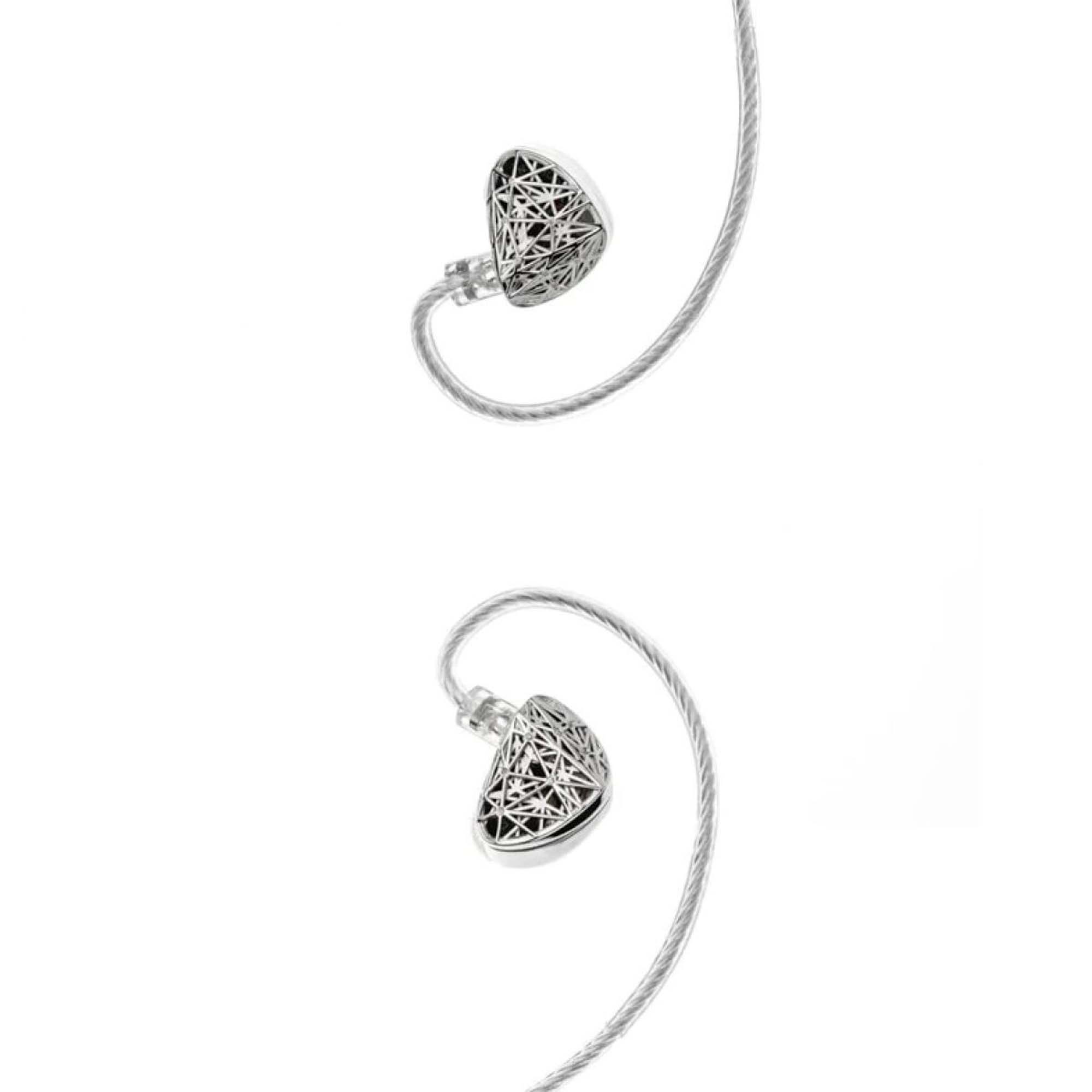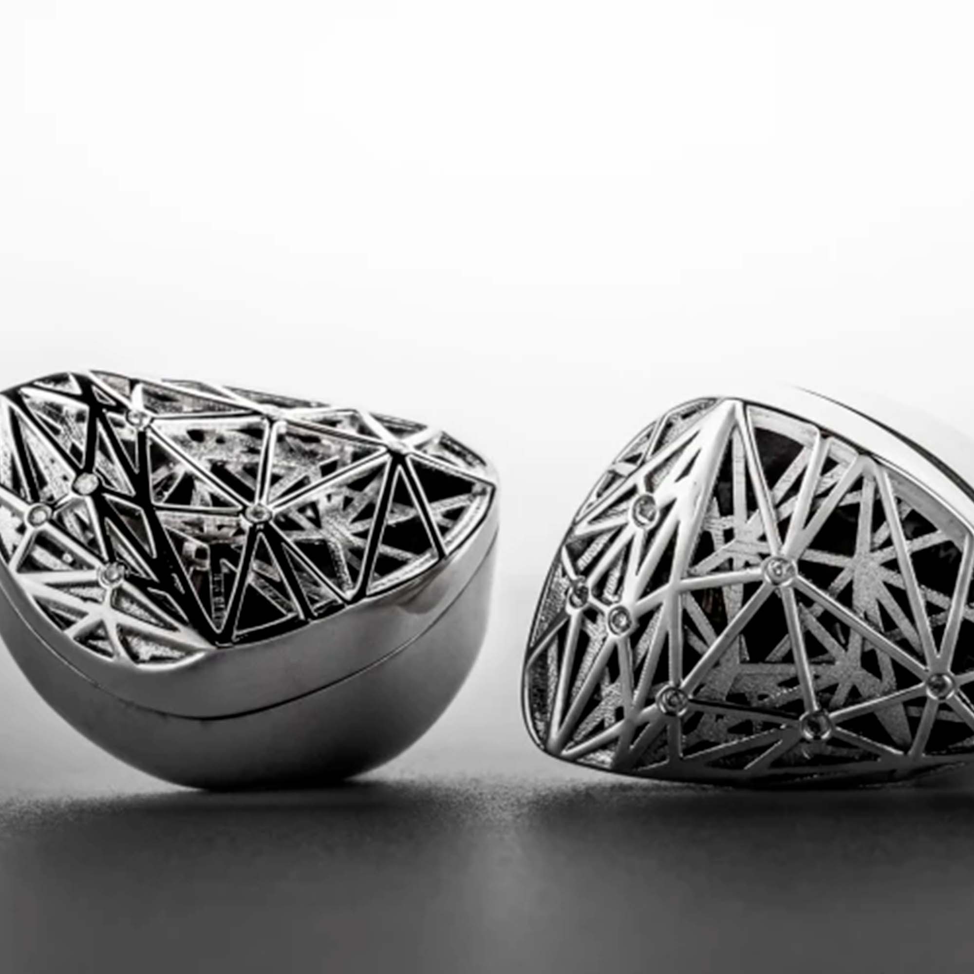 The headphones' body is made of silver with a platinum coating. The external panel is adorned with a lattice design featuring seven zircon stones, showcasing the premium status of the device.