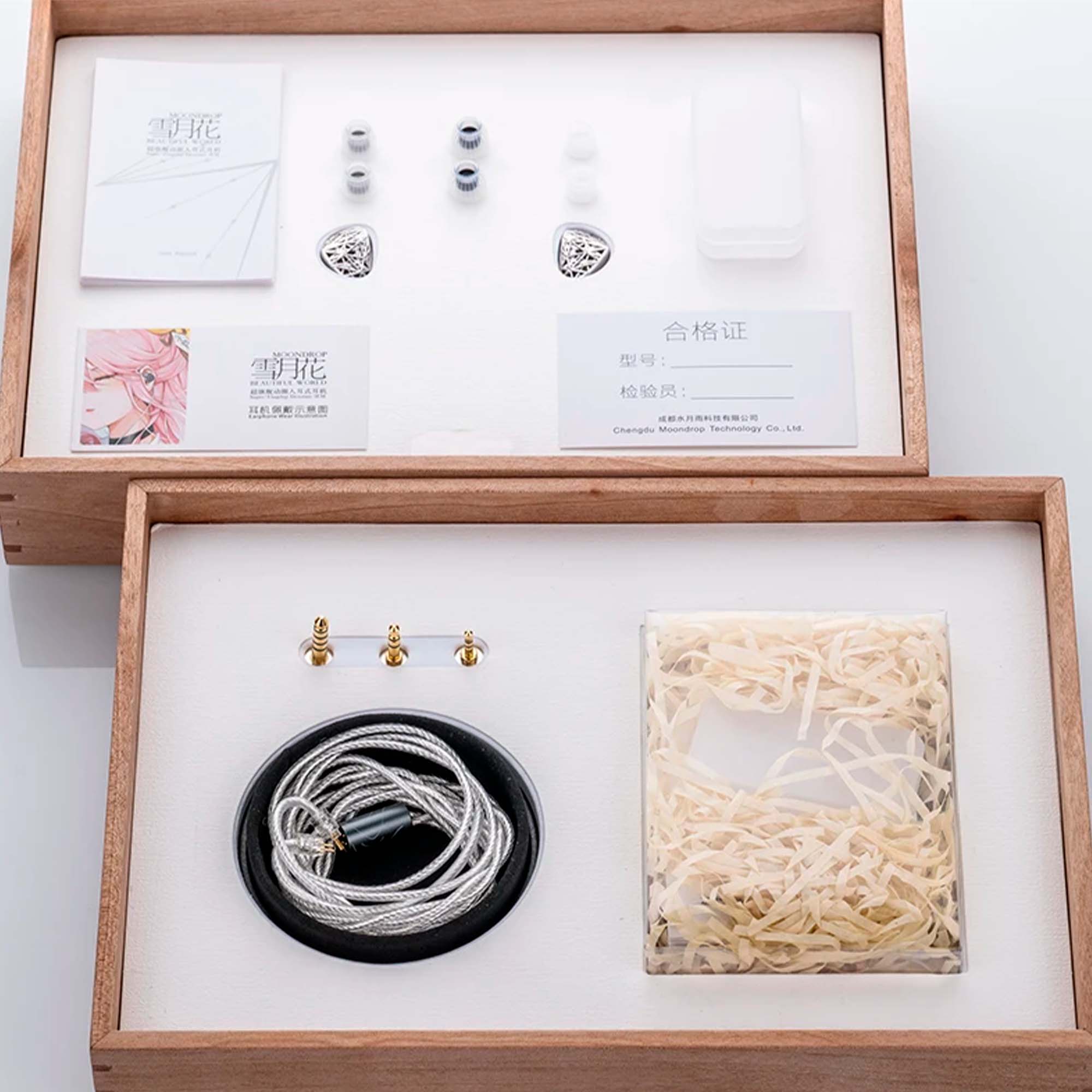 The Moondrop Beautiful World set includes a wooden gift box, a sharkskin leather case, three sizes of Spring Tips ear tips (S/M/L), a plastic ear tip case, a certificate of authenticity, and the RAFFIA album.