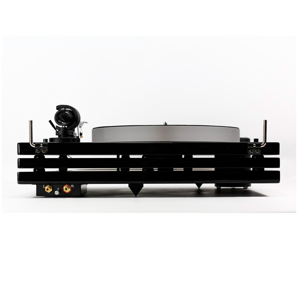 The turntable features a "Project 9cc" tonearm, a solid 9-inch tonearm with a carbon fiber arm tube and cartridge mount. The inverted bearing uses four hardened Swiss ABEC 7 races. The center of gravity of the counterweight is at the same level as the stylus tip. The counterweight is decoupled from the tonearm and acts as a resonance damper. The tonearm also has adjustable vertical tracking angle [VTA], a damped micro lift, and high-quality flexible internal wiring made of specially pure copper.