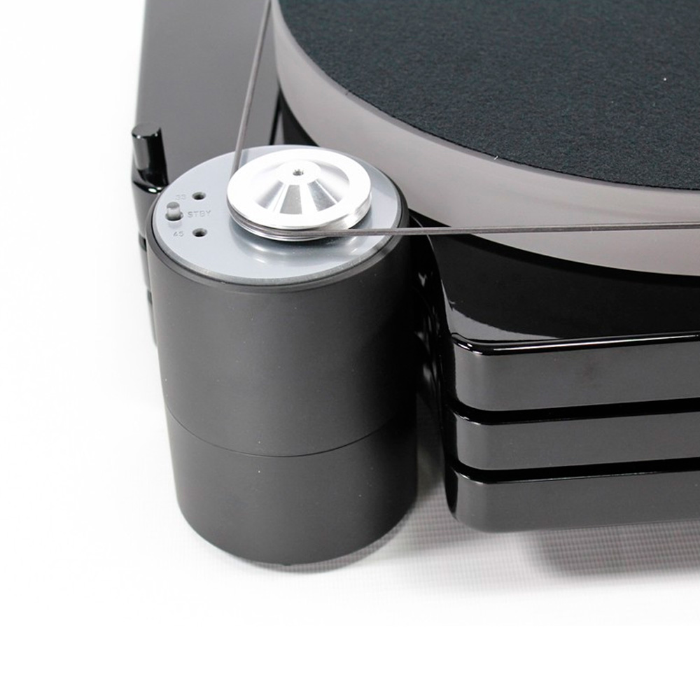 The drive belt wraps around a 1-inch (25 mm) acrylic support disc. Acrylic was chosen for its excellent acoustic qualities and isolating properties. The support disc rotates on an exceptionally quiet inverted ceramic bearing. A soft felt mat is included in the standard setup of the turntable.