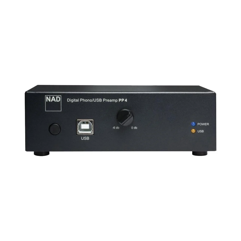 The NAD PP 4 phono preamp is a versatile device that allows you to not only play vinyl records with high quality, but also to digitize them to your PC if desired. The device is housed in a relatively small metal case, which protects its circuits from external electrical interference, and is convenient for placement near the turntable. The unit operates on an external DC power supply.