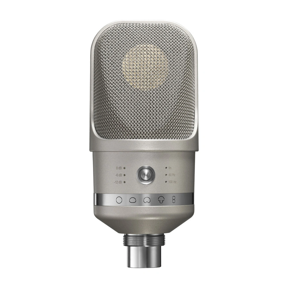 The TLM 107 has linear settings for Low Cut at 40 Hz and 100 Hz, specifically designed for various recording situations. The 40 Hz setting reduces noise below the range of fundamental tones, while the 100 Hz setting is optimized for speech and vocals. A pioneering control concept allows all adjustable microphone functions to be intuitively adjusted using a navigation switch. The backlit display with a chrome bezel shows the current mode, while LEDs indicate the status of the Pad and Low Cut settings.