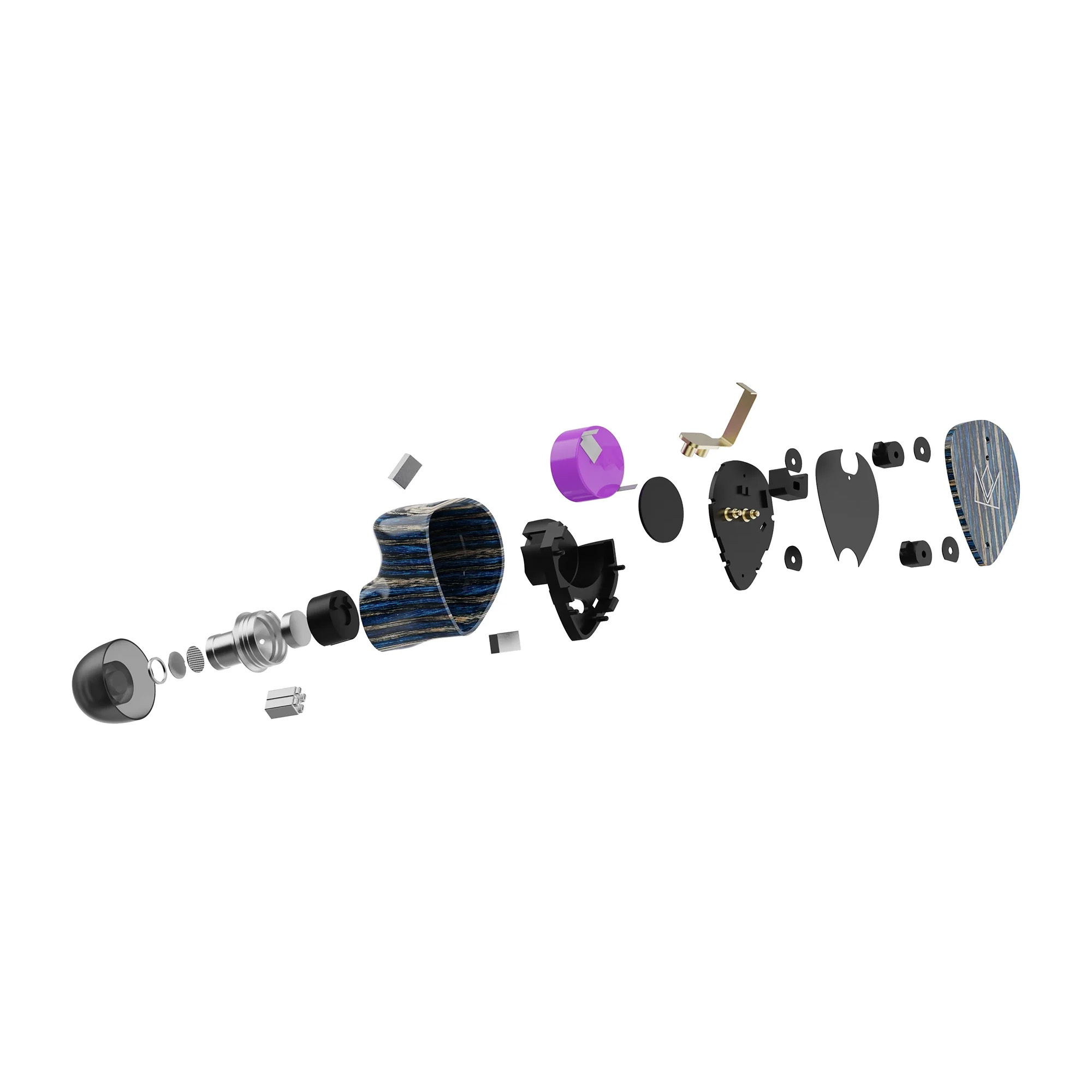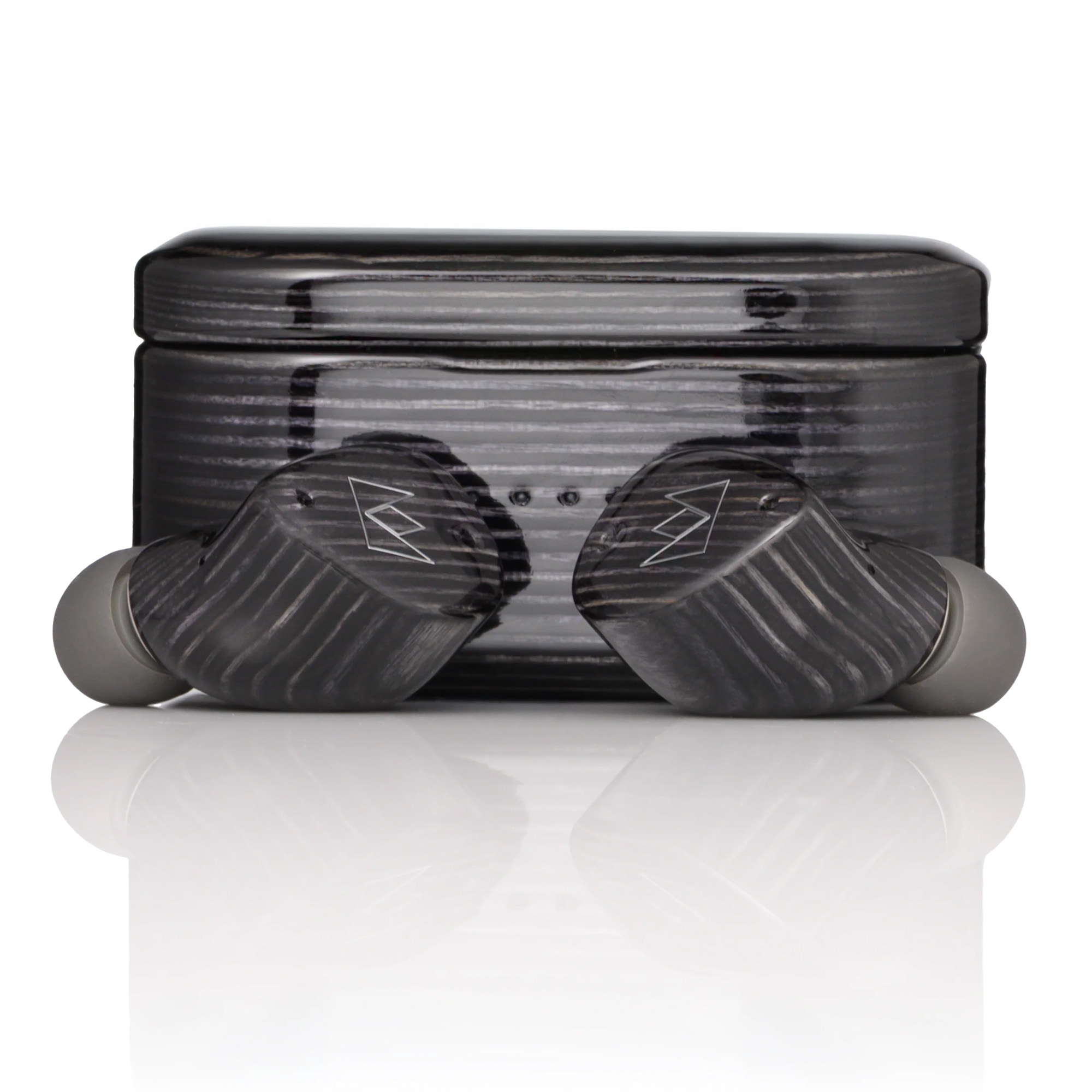 The earpieces and charging case are entirely CNC-machined from solid wood. Each piece has a unique wood texture, ensuring no two headphones look alike. Combined with the reduced and lightweight geometry, this provides excellent finish and secure fit without fatigue during long listening sessions.