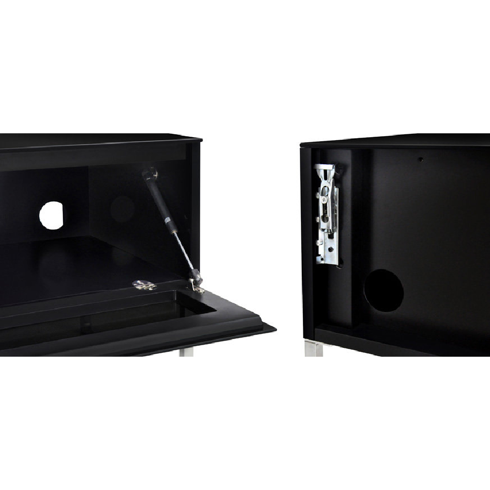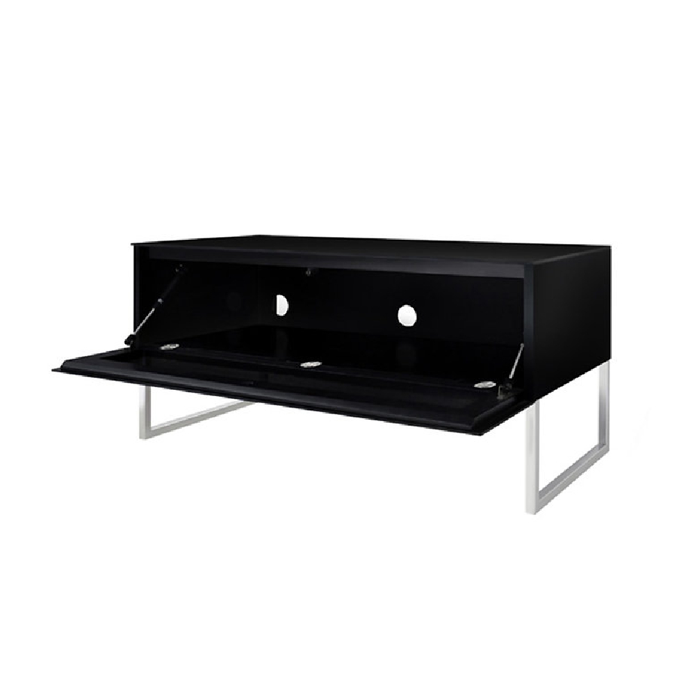 Structure: Lacquered MDF and chromed steel legs. Glass door allowing infrared rays from remote controls to pass through.